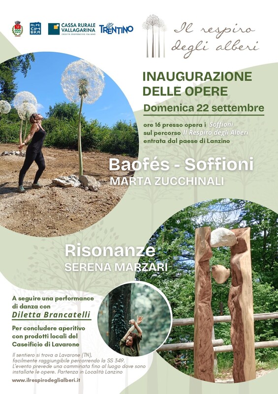 Inaugurazione di due nuove opere sul sentiero Il Respiro degli Alberi: Baoffes-Soffioni di Marta Zucchinali e Risonanze di Serena Marzari. Seguirà una performance di danza con Diletta Brancatelli e un aperitivo con i prodotti locali del Caseificio di Lavarone. Ore: 16:00 Luogo: Respiro degli Alberi (ritrovo presso l'opera "I soffioni") Info: APT Alpe Cimbra 0464724100 o info@alpecimbra.it