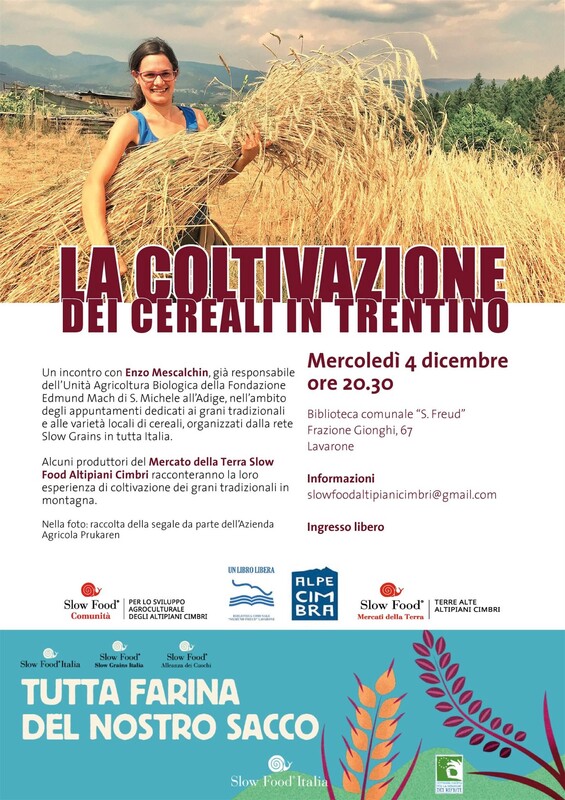 La coltivazione dei cereali in Trentino; un incontro con Enzo Mescalchin, responsabile dell'Unità Agricoltura Biologica della Fondazione Mach, nell'ambito degli appuntamenti dedicati ai grani tradizionali e alle varietà locali di cereali organizzati dalla rete Slow Grains. Alcuni produttori Slow Food Altipiani Cimbri racconteranno la loro esperienza di coltivazione dei grani tradizionali in montagna. Ingresso libero.