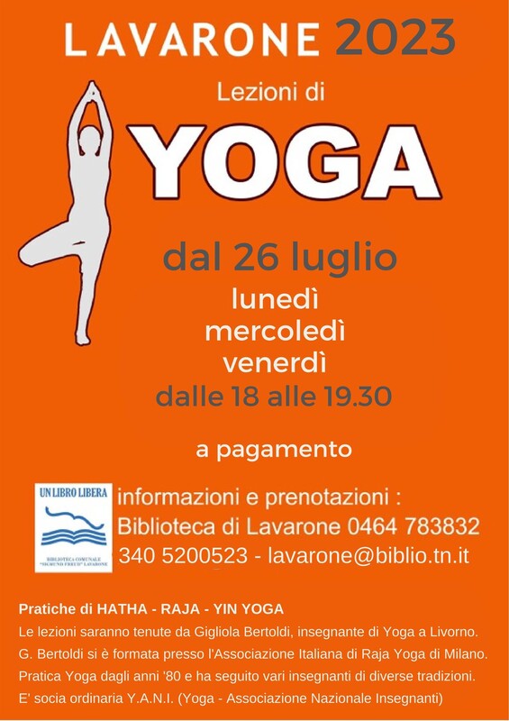 Lezione di Yoga con Gigliola Bertoldi. Luogo: Scuola Secondaria, Gionghi Ore: 18.00 *A Pagamento Info e iscrizioni entro il giorno precedente: Biblioteca Comunale di Lavarone | 0464 783832 | lavarone@biblio.tn.it