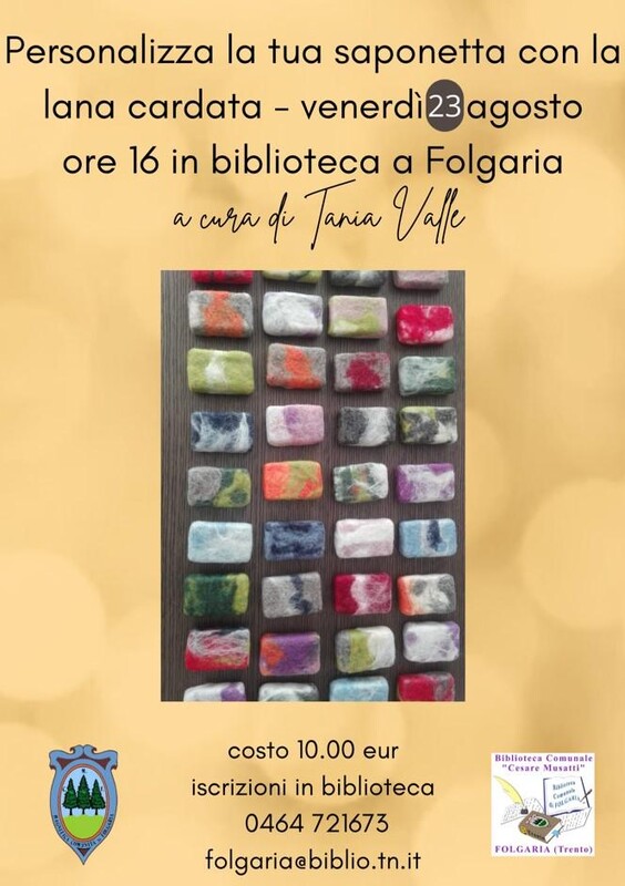 Personalizza la tua saponetta con la lana cardata, un laboratorio a cura di Tania Valle. Ore: 16:00 Luogo: Biblioteca di Folgaria Costo: 10€ Info ed iscrizioni obbligatorie: Biblioteca di Folaria 0464 721673 o folgaria@biblio.tn.it