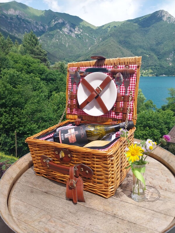 Un gustoso picnic in mezzo al prato, circondato dai filari del vigneto sulle sponde del lago di Ledro.