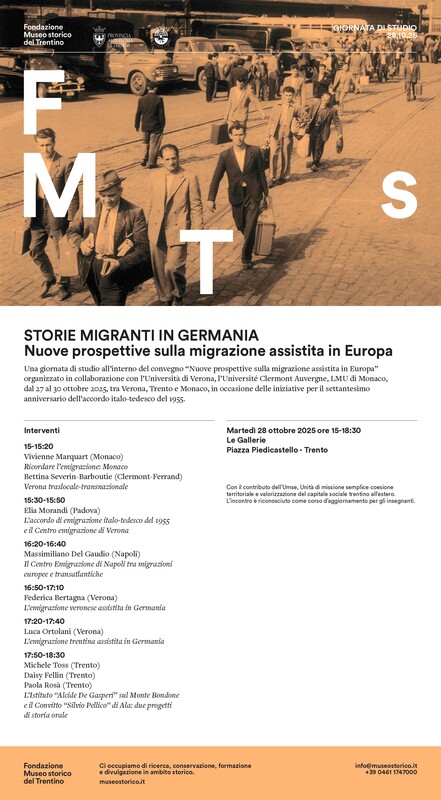 Una giornata di studio all’interno del convegno “Nuove prospettive sulla migrazione assistita in Europa” organizzato in collaborazione con l’Università di Verona, l’Université Clermont Auvergne, LMU di Monaco, dal 27 al 30 ottobre 2025, tra Verona, Trento e Monaco, in occasione delle iniziative per il settantesimo anniversario dell’accordo italo-tedesco del 1955.