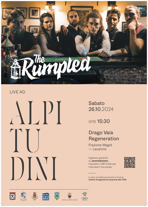 In occasione del festival Alpitudini, concerto dei The Rumpled, band celtic punk nata in Trentino e reduce da un tour di oltre 50 date in tutta Europa. L'evento supporta la raccolta fondi per la realizzazione del docufilm Nella Pelle del Drago. Ore: 15:30 Luogo: Drago Vaia Regeneration. In caso di maltempo l'evento si terrà al Centro Congressi di Lavarone alle 17:30. Evento gratuito su prenotazione PRENOTA QUI