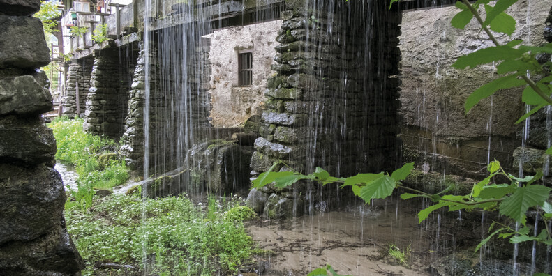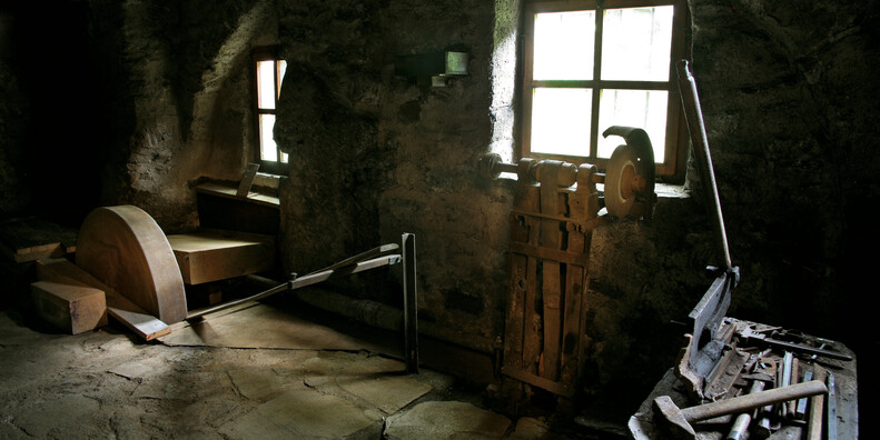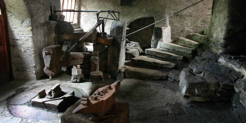 Incudini, martelli, tenaglie, la vasca della tempera e un campionario della strumentazione prodotta documentano l’attività che dal lingotto di ferro porta al prodotto manufatto. All’esterno sono ancora ben visibili e funzionanti le strutture per la captazione dell’acqua del torrente Rabbiés, che in parte seguono l’andamento del terreno e in parte sono sostenute da grandi travature lignee e alti pilastri in pietra, che permettevano di mettere in funzione la ruota idraulica del maglio. Seminfossata, a breve distanza dalla fucina, è la tromba idraulica o “bót de l’òra” per l’alimentazione della forgia.