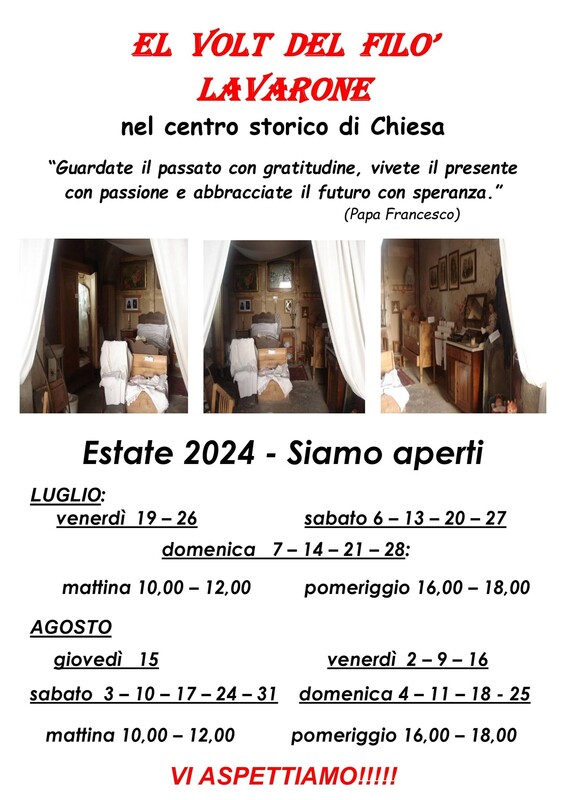 El volt del filò: piccolo museo etnografico nel centro storico di Chiesa. Luogo: centro storico di Chiesa Ore: 10 - 12 e 16 - 18 Info: Done del Filò filosanfloriano@yahoo.it