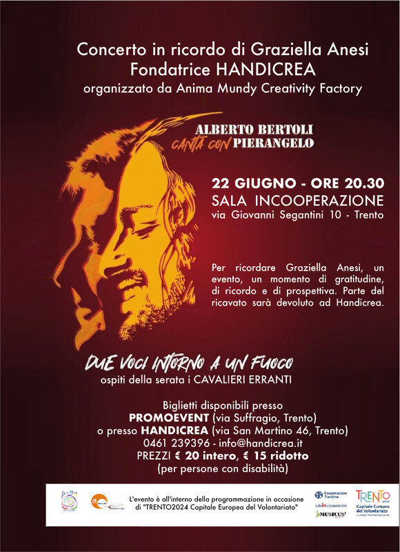 Info: Biglietti disponibili presso PROMOEVENT (via Suffragio, Trento) o presso HANDICREA (via San Martino 46, Trento) 0461 239396 - info@handicrea.it PREZZI € 20 intero, € 15 ridotto (per persone con disabilità); parte del ricavato sarà devoluto ad Handicrea.