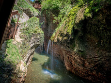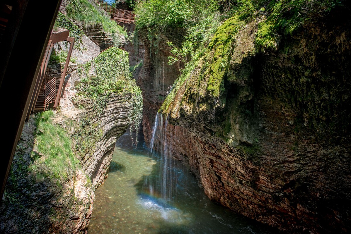 Il percorso è semplice ma articolato. Cammini su passerelle metalliche e scalinate con corrimano, attraversi tratti coperti e alcuni balconi esposti. La sensazione è di stabilità: il tracciato è stato progettato per accompagnarti passo dopo passo, con soste ai punti più significativi. In alcuni passaggi la gola si restringe e la quota dell’affaccio cambia: è qui che vedi bene la sezione della forra e l’impatto del salto d’acqua sul fondo. La visita guidata dura circa 45 minuti, di cui una ventina di cammino effettivo. Non è accessibile a passeggini o carrozzine e può creare disagio a chi soffre di vertigini o claustrofobia; se è il tuo caso, confrontati con la guida prima di partire.