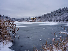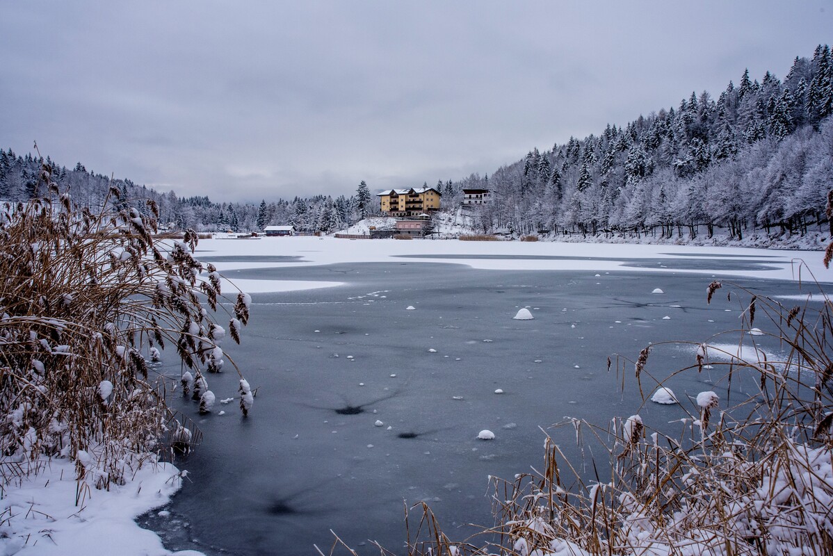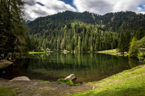 Un sentiero semplice e regolare compie il giro completo del lago in circa trenta minuti di cammino tranquillo. Il percorso, in gran parte pianeggiante, alterna tratti lastricati e sterrati e si presta anche a passeggini e camminate lente. Lungo il tracciato una serie di brevi deviazioni porta quasi a sfiorare l’acqua, dove si osservano pesci e si colgono riflessi del bosco sulla superficie. La passeggiata offre punti di vista diversi: da un lato il profilo degli alberghi storici affacciati sulla riva, dall’altro la fascia di conifere che avvolge la conca. È un itinerario adatto in ogni momento della giornata, anche come breve uscita serale.
