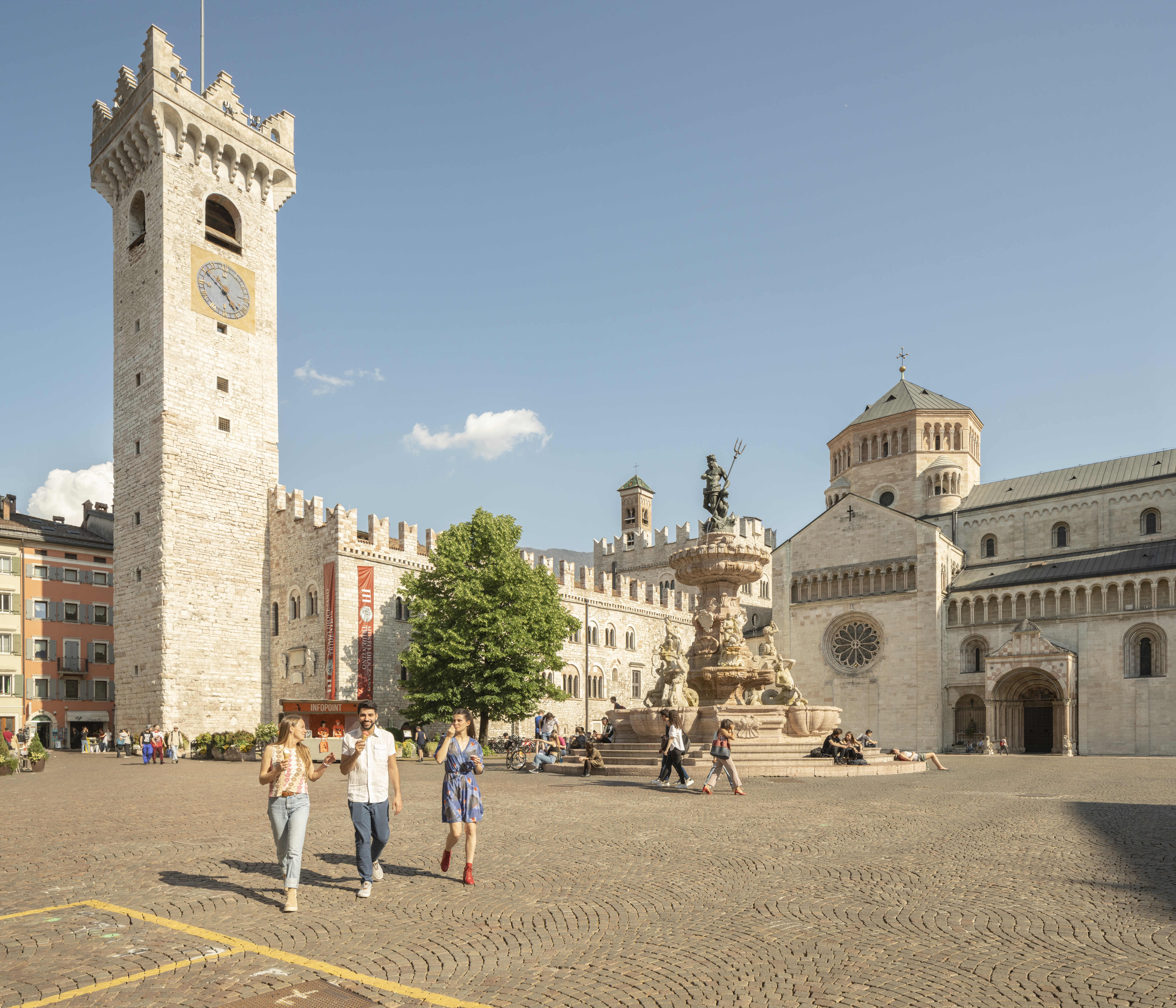 Una visita a Trento non può che partire da Piazza Duomo. Qui l’effetto scenografico è sorprendente: case affrescate di epoca rinascimentale, una successione di palazzi dal delicato cromatismo, il Palazzo pretorio, con la svettante Torre civica. Al centro la fontana barocca del Nettuno e alle spalle la cattedrale dedicata a San Vigilio, esempio magistrale di stile romanico – lombardo. Si può quindi percorrere la via Belenzani, l'antica "contrada larga", una successione di palazzi cinquecenteschi, e poi girare a destra nella via Manci, "contrada longa", che propone ulteriori tesori architettonici rinascimentali e barocchi, fino al caratteristico "Cantone". Da qui in pochi minuti si giunge al Castello del Buonconsiglio. Insieme alla Piazza Duomo è il simbolo della città e dal 1225 al 1803 fu la residenza dei Principi vescovi di Trento. Ospita le collezioni provinciali e mostre temporanee. Il cuore della vita cittadina gravita sul "giro al sas", un antico quartiere abbattuto negli anni '30 per fare posto alla Piazza Cesare Battisti, sotto la cui pavimentazione si può visitare la città più antica, la romana "Tridentum". Il quadrilatero di strade che lo circondava sono oggi il luogo tradizionale del passeggio dei trentini, dello shopping nelle numerose botteghe storiche e del lifestyle tipicamente italiano.