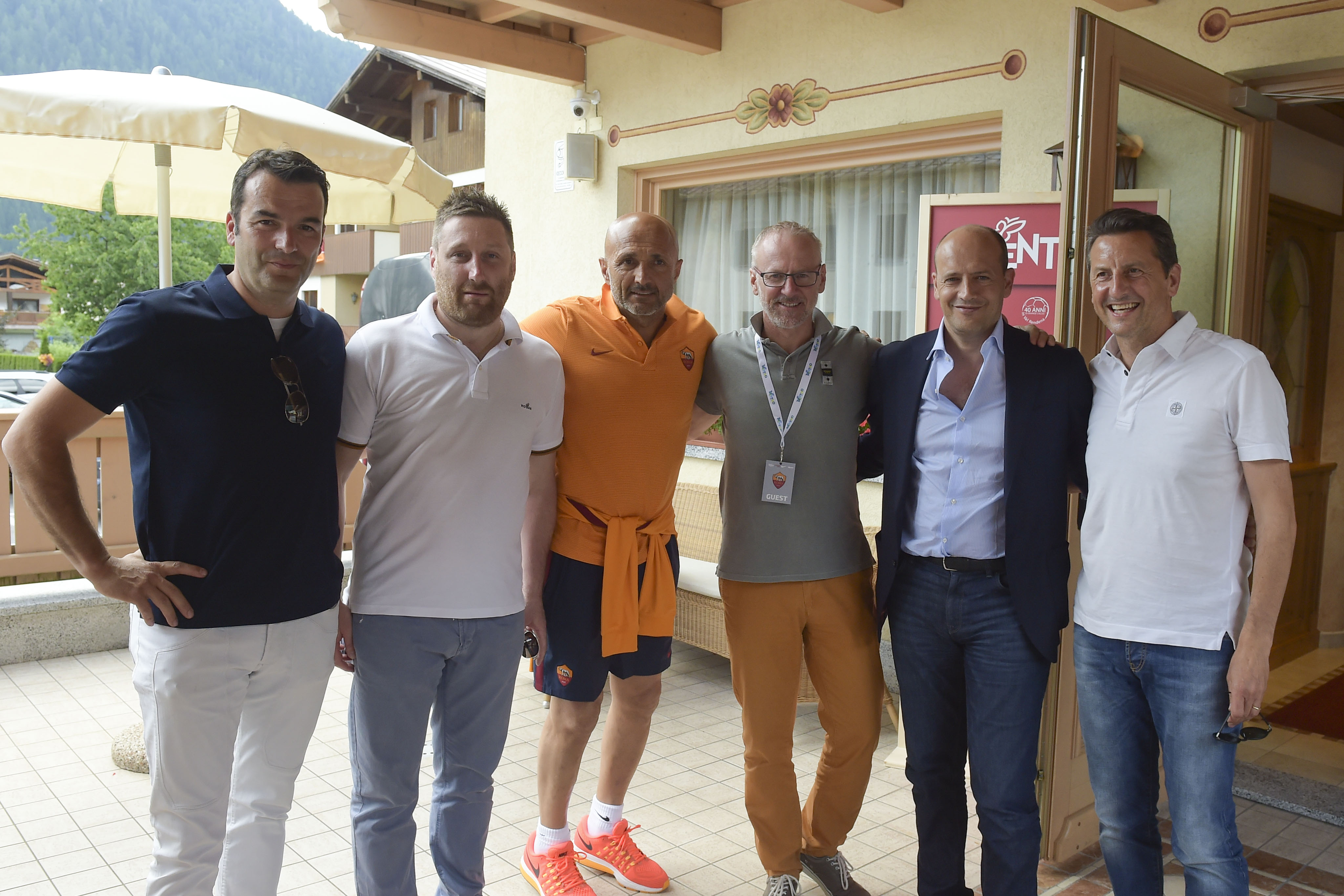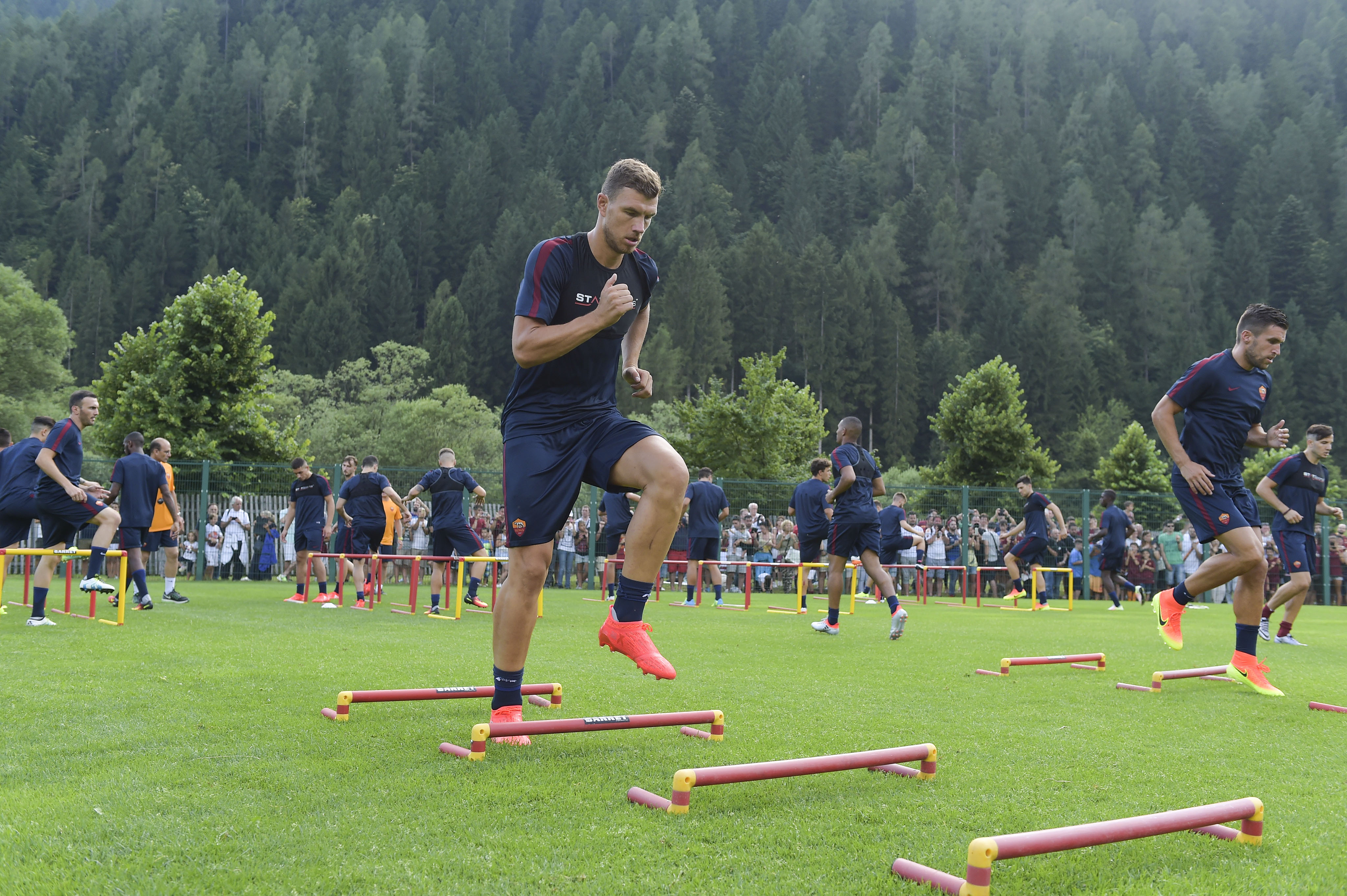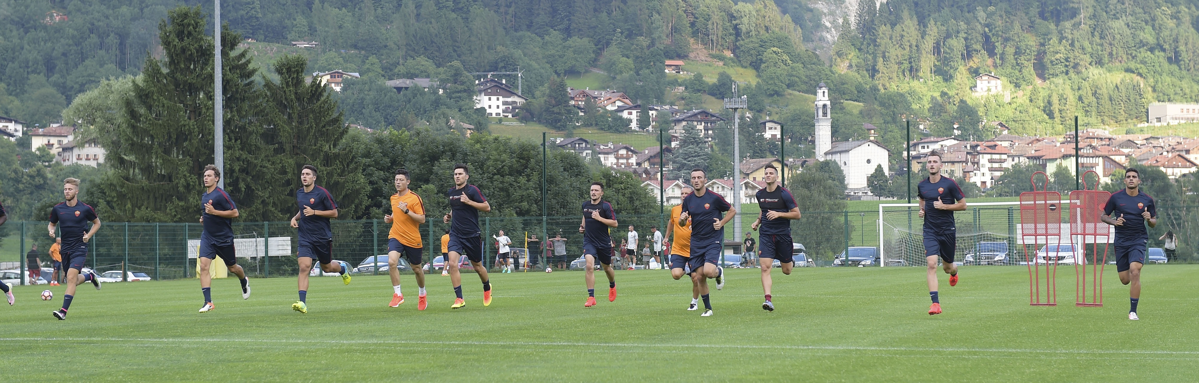 La Roma, in Trentino per il secondo anno consecutivo, ha raggiunto Trento in treno nel primo pomeriggio, completando il trasferimento verso Pinzolo in pullman e mettendosi immediatamente agli ordini di Luciano Spalletti per la prima seduta d’allenamento all’ombra delle Dolomiti. Quasi 3000 i tifosi di fede giallorossa che hanno voluto salutare ed incitare i propri beniamini dagli spalti del centro sportivo Pineta e che hanno approfittato della giornata di sole per concedersi la prima visita al rinnovato Rendena Village allestito nella zona antistante il rettangolo di gioco, con lo store ufficiale e i giochi per i bambini particolarmente apprezzati dai sostenitori, grandi e piccini, romanisti. Nonostante i Campionati Europei in corso e la recente Coppa America privino naturalmente le grandi squadre di alcuni dei loro pezzi pregiati, a Pinzolo non mancano i giocatori di caratura internazionale. Un nome su tutti, quello di capitan Francesco Totti, ovviamente tra i più acclamati dal pubblico assieme all’olandese Strootman. Poco prima delle 18 un boato ha accolto l’ingresso in campo di Luciano Spalletti, mentre la squadra si è dedicata inizialmente ad un lavoro fisico in palestra. La seconda parte dell’allenamento si è svolta sul campo, incentrata principalmente sul lavoro aerobico prima di concludere la seduta con esercitazioni tecnico-tattiche con il pallone.