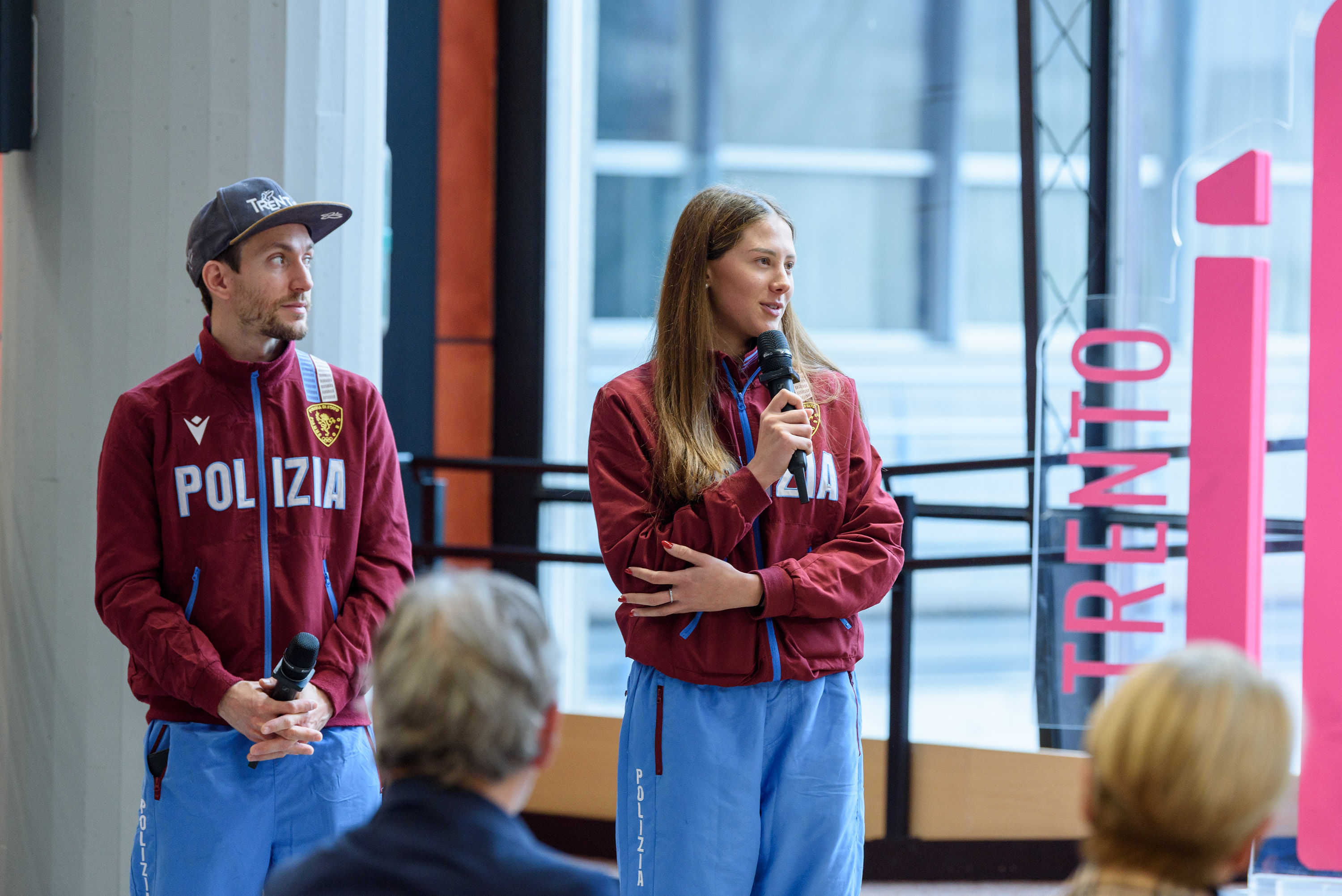 La conferenza è stata moderata da Giampaolo Pedrotti capo Ufficio Stampa della Provincia e sono intervenuti gli atleti Stefano Ghisolfi, il Climber del Gruppo Sportivo Fiamme Oro e la combinatista nordica Annika Sieff del Gruppo Sportivo Fiamme Oro.
