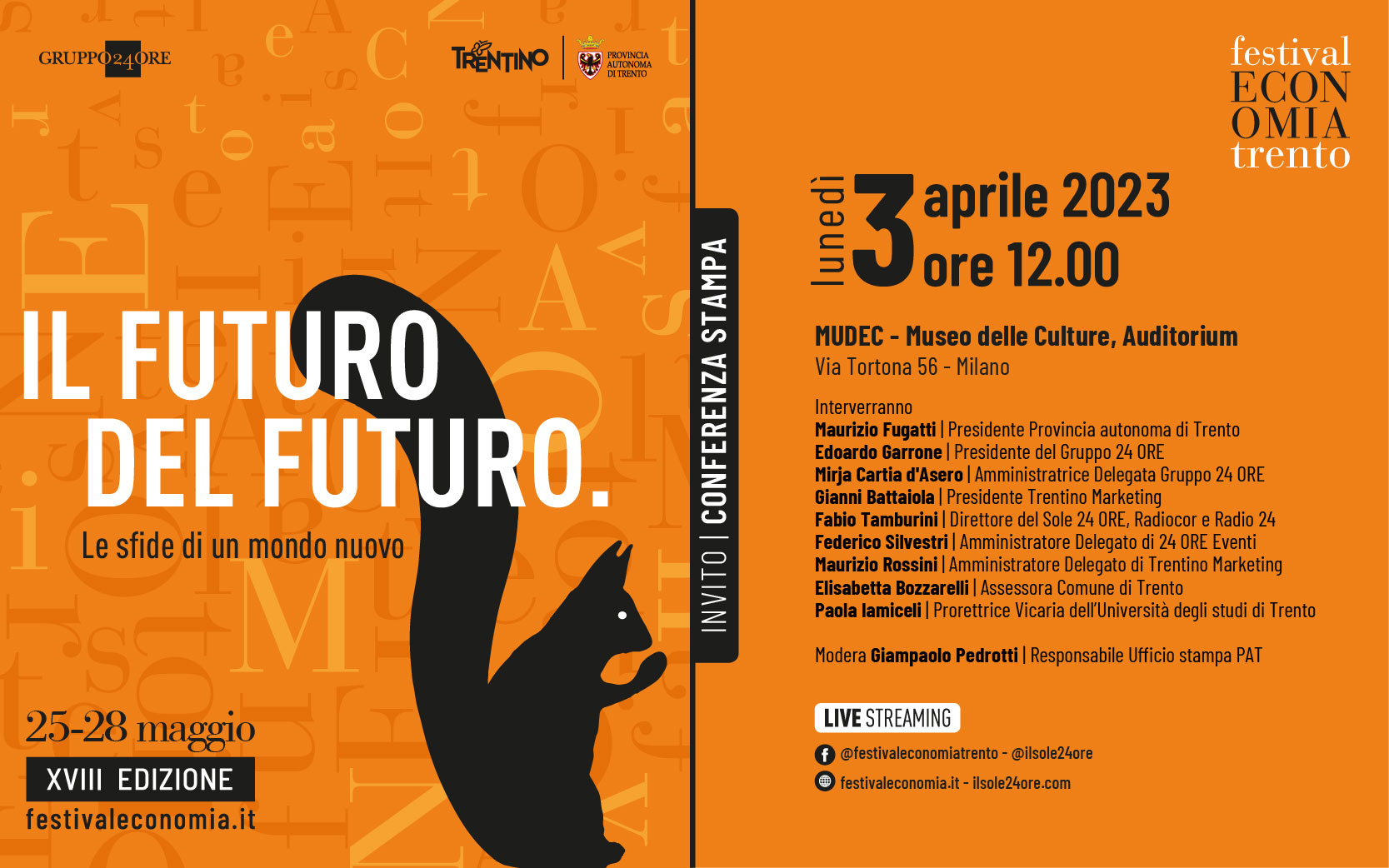 Negli spazi del Museo delle culture è stata svelata l’edizione numero 18 della grande kermesse dello Scoiattolo, in programma dal 25 al 28 maggio 2023. Numerosi gli ospiti che hanno presentato assieme il calendario che porterà in Trentino 6 Premi Nobel, 90 relatori del mondo accademico, 40 economisti, 35 relatori internazionali, 40 tra manager e imprenditori, ben 19 Ministri. Una quattro giorni estremamente ricca, con 260 eventi grazie ad un lavoro in partnership svolto dal Gruppo 24 ORE e di Trentino Marketing, nel ruolo di organizzatori per conto della Provincia autonoma di Trento e con il contributo del Comune di Trento e dell’Università di Trento