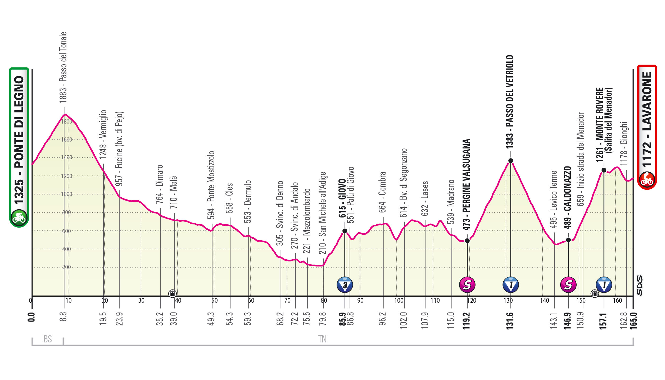 Dopo la partenza da Ponte di Legno, i corridori scaleranno subito il Passo del Tonale passando poi dalla val di Sole e val di Non, Piana Rotaliana, val di Cembra e Valsugana, fino al traguardo di Lavarone, non prima di aver affrontato le durissime salite del Passo del Vetriolo e di Monte Rovere, inerpicandosi sui tornanti della strada del Menador, la storica Kaiserjägestrasse.