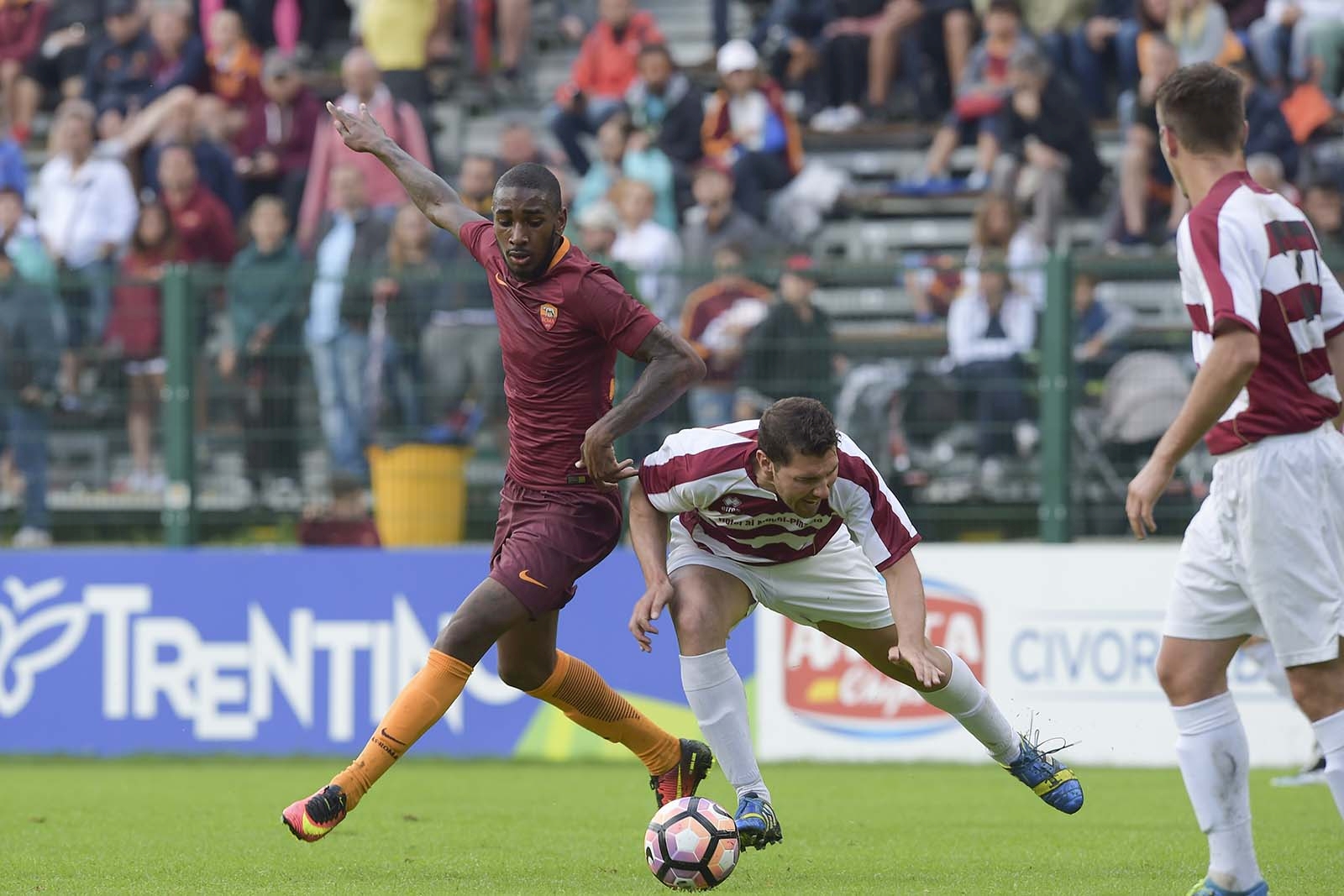 I primi venti minuti sono una sorta di tiro al bersaglio con i volenterosi dilettanti del Pinzolo Campiglio troppo teneri per riuscire ad opporre resistenza. Al 20’ la Roma è già sul 5-0: gloria iniziale per Salah, in rete al 4’ su assist dalla destra di Torosidis e all’8’ su suggerimento di Perotti. Il tris è opera di Dzeko con un tocco ravvicinato dopo una traversa centrata dalla distanza da Strootman, poker del baby D’Urso con un facile piattone sottomisura e cinquina di Dzeko su splendido assist in verticale di Strootman. Al Pineta si gioca praticamente a porta romana con la Roma abile a far girare palla e a creare occasioni in rapida successione: al 24’ Dzeko insacca il suggerimento dalla sinistra di Mario Rui, al 27’ gloria per un propositivo Torosidis, al 32’ poker personale di Dzeko, abile a svettare a centro area e ad insaccare il cross al bacio di Perotti. Iniziano le prime sostituzioni (tra i giallorossi fuori D’Urso e dentro Soleri) ma non muta di una virgola l’inerzia del match, con Perotti che al 42’ recupera palla al limite dell’area e batte Cereghini con un preciso rasoterra. È la rete del 9-0, punteggio con il quale si chiude la prima frazione di gioco.