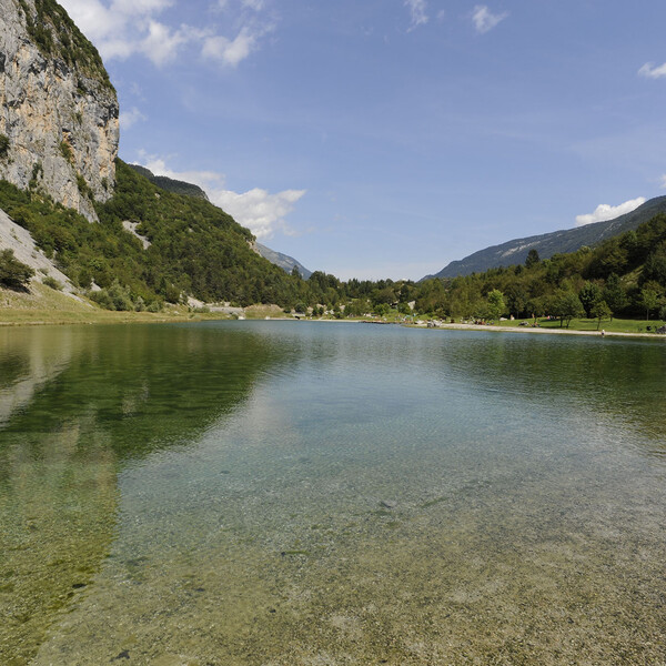Nell’ampia valle glaciale del Sarca, tra Dro e Pietramurata, in un paesaggio unico in tutto l’arco alpino, quello delle Marocche (un’enorme distesa di massi franati dai monti Brento e Casale), si trova il lago di Cavedine, probabilmente generato per lo stesso fenomeno. Vi si possono pescare diverse varietà di pesce.