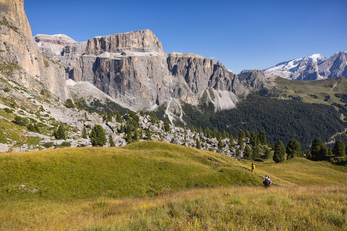 In estate puoi dedicarti a escursioni di varie difficoltà. Ci sono itinerari brevi, adatti anche a famiglie, come il giro nella Città dei Sassi o i percorsi che collegano il passo ai rifugi Salei, Valentini e Friedrich August. Per chi ha più allenamento, il giro del Sassolungo e del Sassopiatto rappresenta una delle esperienze più note: un anello che circonda l’intero massiccio offrendo scorci sempre diversi sulle pareti e sui pendii erbosi.