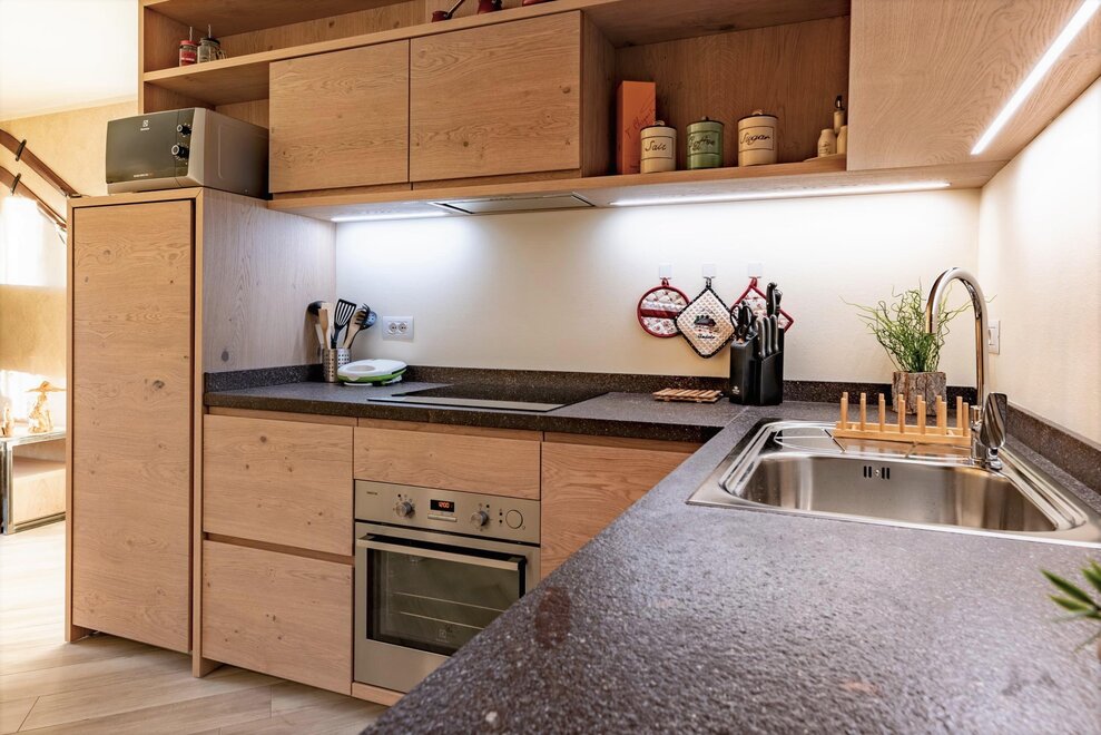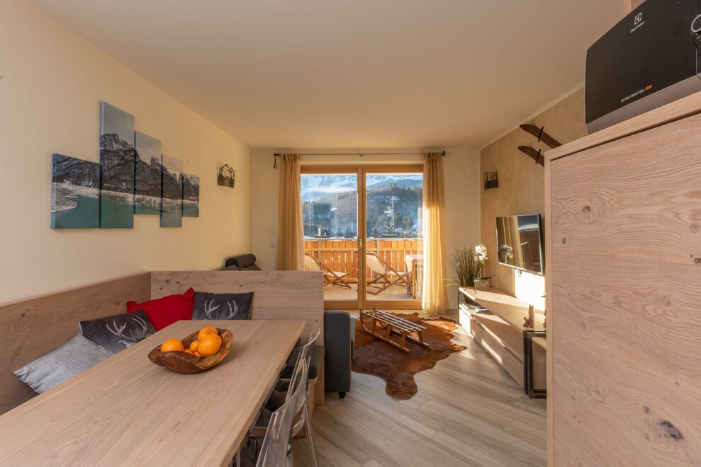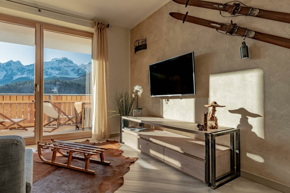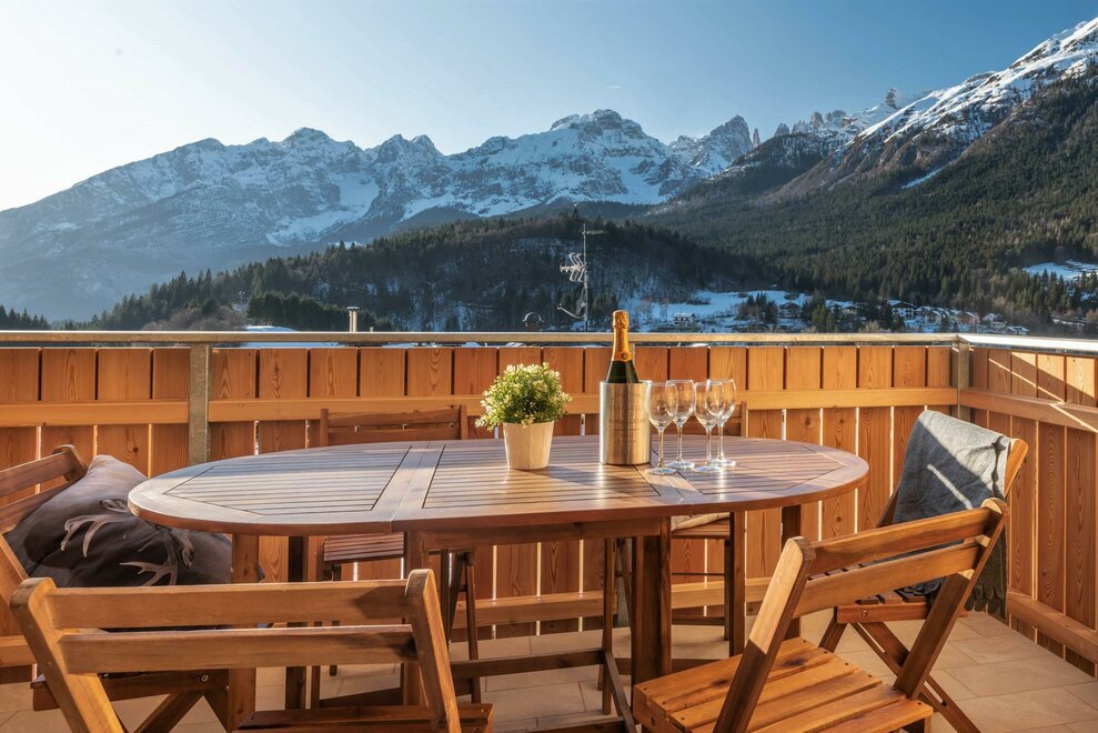 Vloerverwarming, grote houten ramen met triple beglazing en verhoogde isolatie aan de buitenkant zorgen ervoor dat het Panoramic appartement zeer licht, warm in de winter en koel in de zomer is. De zeer lichte woonkamer/keuken komt direct uit op een terras met een prachtig uitzicht op de Dolomieten van Brenta. Slaapkamer met een tweepersoonsbed en balkon, daarnaast een kleine slaapkamer, zonder raam, met een stapelbed. Ruime badkamer met douche. Opslag voor ski's of fietsen. Totaal m²: 72. Voorzieningen: 2 Smart TV's met flatscreen, koelkast met vriezer, magnetron, vaatwasser, wasmachine, elektrische waterketel, broodrooster, gratis WI-FI, Nespresso-koffiezetapparaat, welkomstpakket.