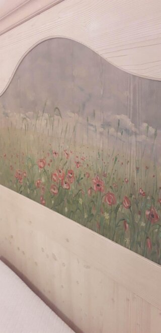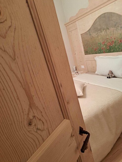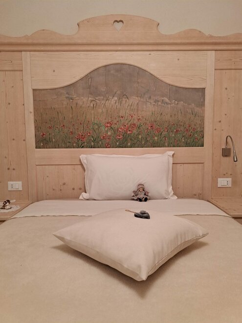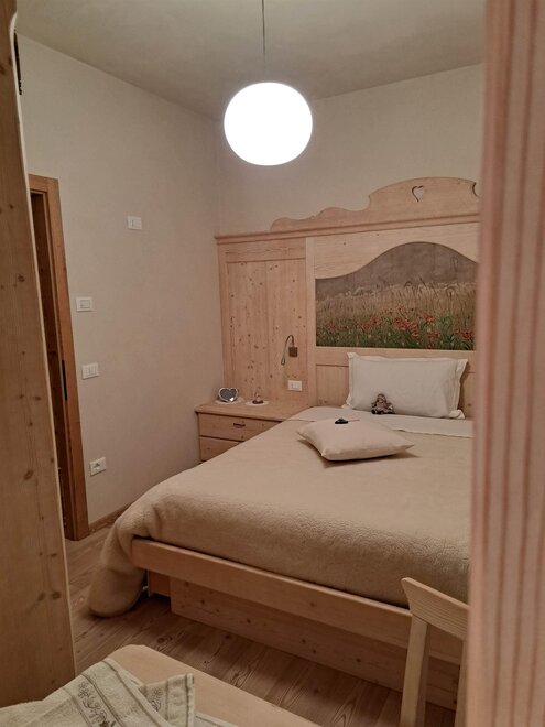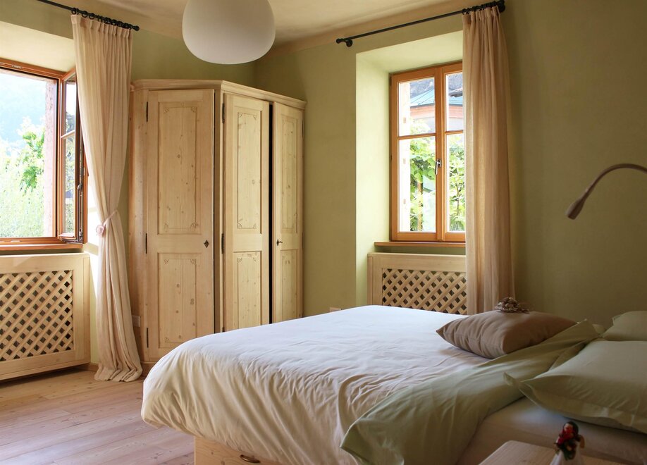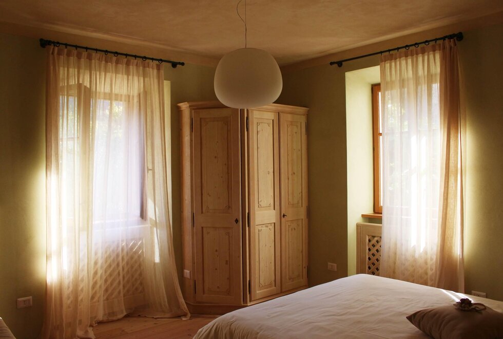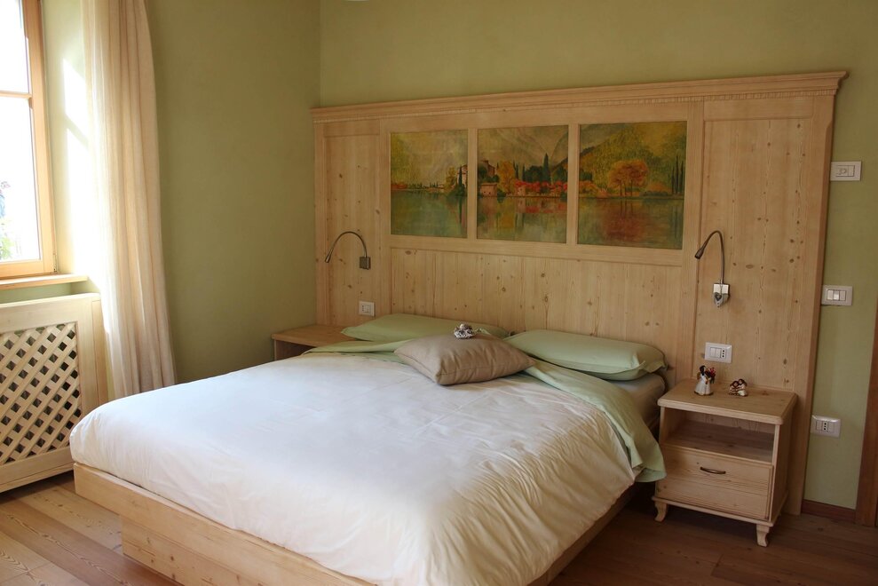 De meest ruime kamer die uitkijkt op de tuin, hebben we "Castel Toblino" genoemd; het hoofdeinde van het bed heb ik persoonlijk geschilderd en het vertegenwoordigt voor mij de "parel" van ons dichtstbijzijnde gebied: het romantische en charmante Castel Toblino slechts 5 minuten van onze accommodatie. In dezelfde kamer is er een bank/bed dat kan worden gebruikt voor zowel volwassenen als kinderen.