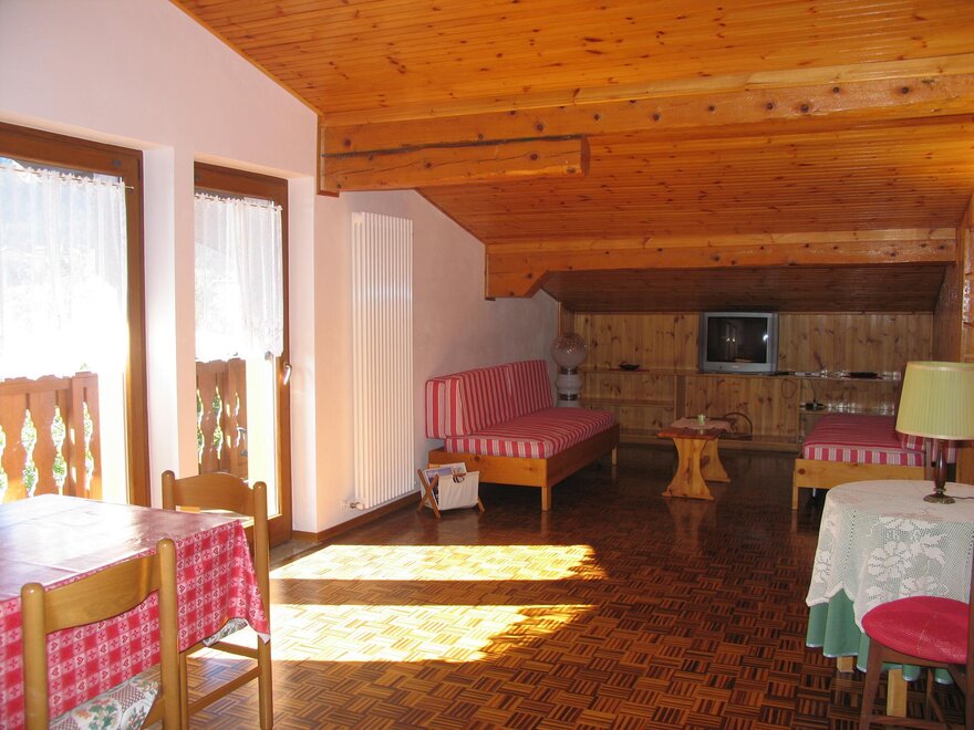 Het gebouw beschikt over een ruime tuin met ligstoelen tot beschikking van de gasten, open parkeerplaatsen, skiopslag, volledig en comfortabel ingerichte appartementen, gemiddeld bestaande uit 3/4 slaapkamers, allemaal voorzien van een ruime woonkamer met banken en stoelen, keuken, balkon, badkamer met douche of bad, wasmachine, kleuren-TV.