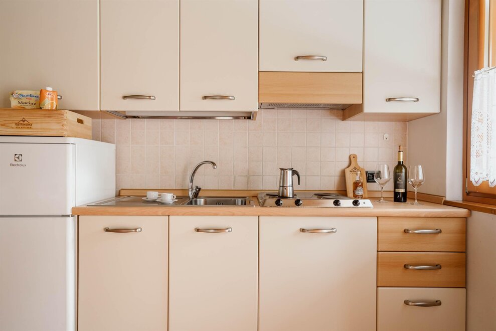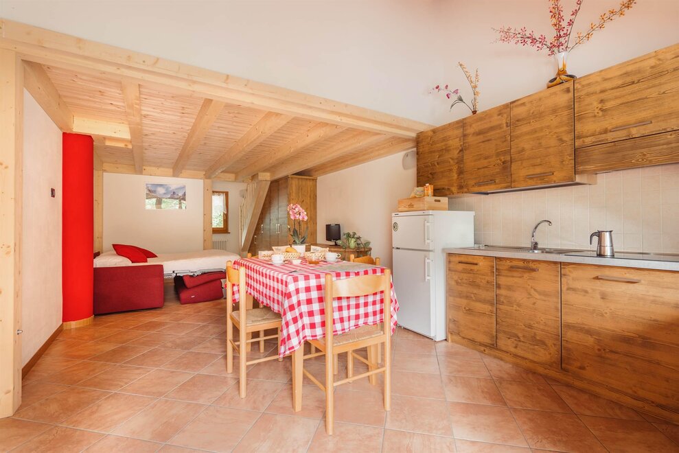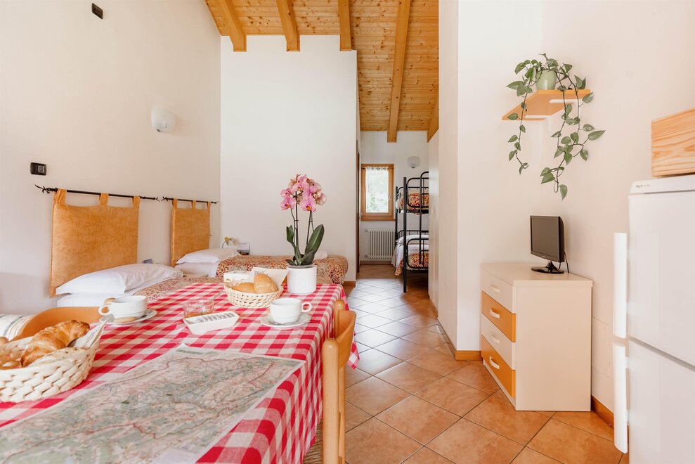 De appartementen liggen op de eerste verdieping van de structuur aan de zuidkant van de camping, en beschikken over een lift, ideaal ook voor mensen met een handicap. Elke wooneenheid is een studio bestaande uit een volledig uitgeruste kitchenette, een badkamer met douchecabine, 4 slaapplaatsen met de mogelijkheid om een vijfde bed toe te voegen, tv en autonome verwarming (in het winterseizoen). Bovendien ontvangt u beddengoed, tafelkleden en theedoeken, 2 handdoeken per persoon en een douchemat.