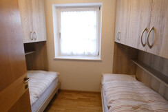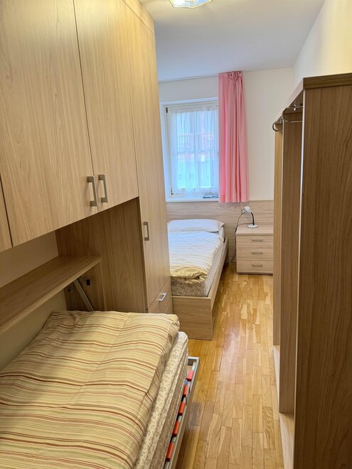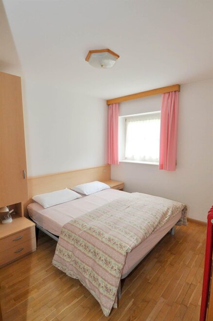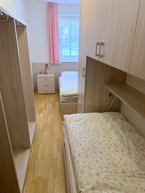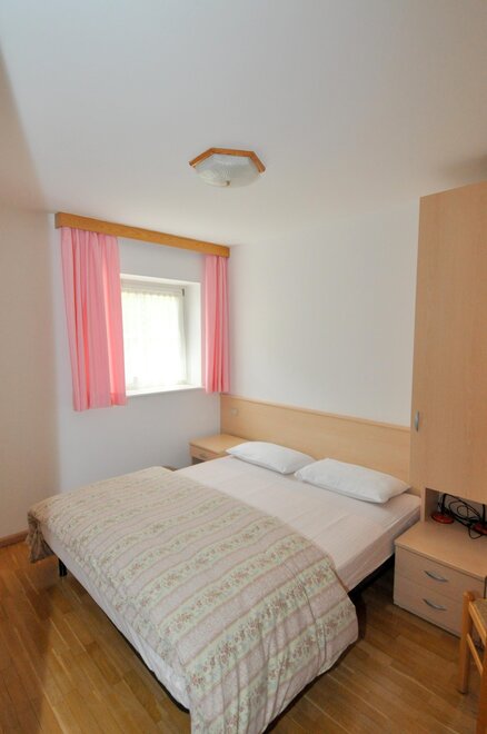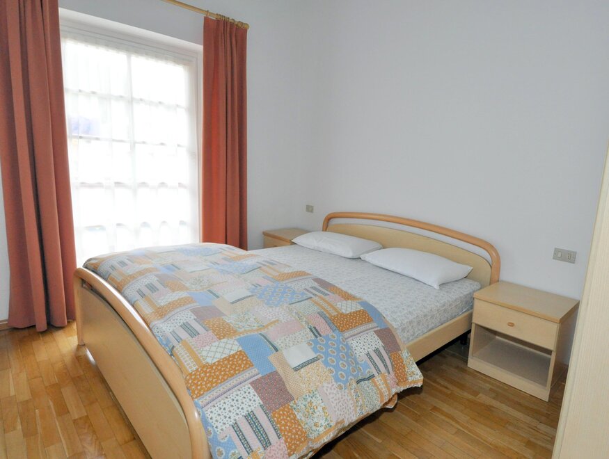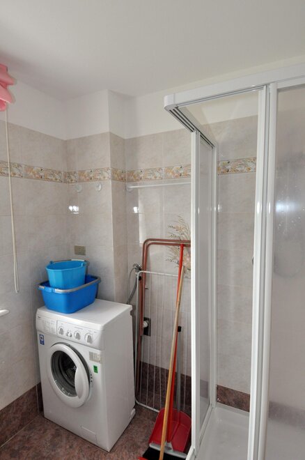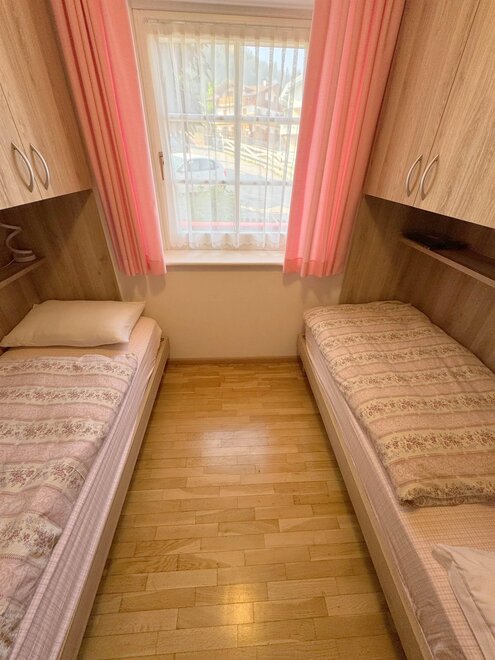 Driekamerappartement op de eerste verdieping, bestaande uit een slaapkamer met een tweepersoonsbed, een kamer met twee eenpersoonsbedden, een badkamer met douche, wasmachine, kleine zithoek met kitchenette, magnetron en waterkoker, vaatwasser, drie balkons.