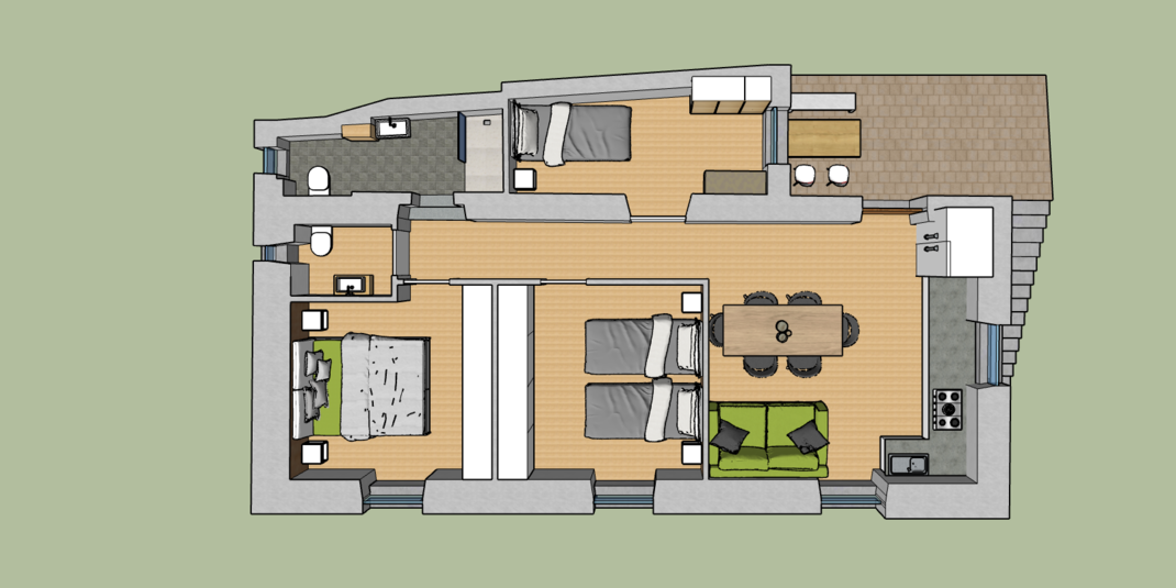Appartement (80m²) bevindt zich op de 1e verdieping en heeft 3 slaapkamers (1 met een tweepersoonsbed, 1 met twee eenpersoonsbedden, 1 eenpersoonskamer), 1 keuken/woonkamer, 2 badkamers (1 douche/WC, 1 WC), buitenruimte uitgerust met tafel en stoelen. Ingang met code toegang, satelliet-TV, airconditioning, vloerverwarming, gratis Wi-Fi-internet, rookmelder, vaatwasser, inductiekookplaat. Badkamer voorzien van alle noodzakelijke hygiëneartikelen. Bedlinnen, keuken- en badlinnen zijn bij de prijs inbegrepen. Een parkeerplaats in de garage.