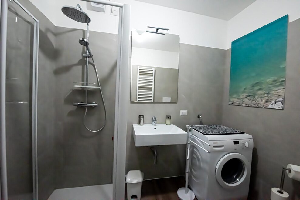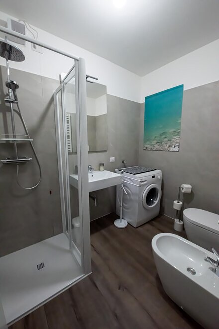 Badkamer met haardroger, wasmachine, bidet, douche.