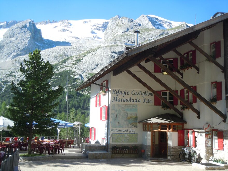 Gebouwd aan het begin van de twintigste eeuw door Beierse alpinisten uit Bamberg, werd de Rifugio Castiglioni Marmolada gebombardeerd tijdens de Grote Oorlog en vervolgens in de jaren dertig herbouwd door Cai van Milaan. De berghut is opgedragen aan de alpinist Ettore Castiglioni en vanuit de ramen van de eetzaal heeft men een prachtig uitzicht op de Koningin van de Dolomieten, met de noordwand bedekt met de gletsjer waarvan de wateren in de zomer samenkomen in het meer van de Fedaia-pas. Het meubilair (met zorg door de jaren heen bewaard) vertelt verhalen van bergachtige sferen uit vroegere tijden. De berghut is eigendom van de familie Soraruf, die ook de Capanna Punta Penia bezit, de hoogste van de Dolomieten, op de top van de Marmolada. Opening Van begin mei tot begin november Van Kerstmis tot 10 januari Van eind januari tot Pasen Voor de excursie wordt aanbevolen om de actuele opening van de hut te controleren door contact op te nemen met de beheerder. Itinerari Vanuit Passo Fedaia is het mogelijk om de klim naar Punta Penia (de top van de Marmolada) te maken via de normale route die de gletsjer doorkruist: een pad dat kan worden ingekort met de skilift naar Pian dei Fiacconi en dat alpinistische vaardigheden en begeleiding van een berggids vereist (1 uur en 30 minuten tot Pian dei Fiacconi, 3 uur en 30 minuten via de normale route naar Punta Penia). De klim naar de Marmolada is ook mogelijk via de (moeilijke) ferrata van de Cresta Ovest (3,30 uur) via Forcella Marmolada (van waaruit de oversteek naar Rifugio Contrin mogelijk is). Aan de zijde tegenover de Marmolada ligt Rifugio Viel Dal Pan (1,45 uur) of men kan de via ferrata van de Trincee volgen van Porta Vescovo tot Passo Padon met een prachtig uitzicht over de gehele gletsjer (3 uur, gemiddeld moeilijk).