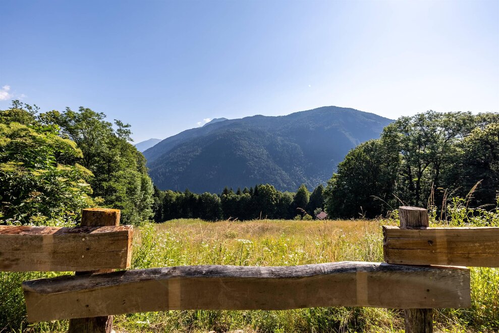 Buiten is de berghut omgeven door bos en een grote tuin, perfect om te ontspannen en te genieten van de natuur met ligstoelen en een parasol.
