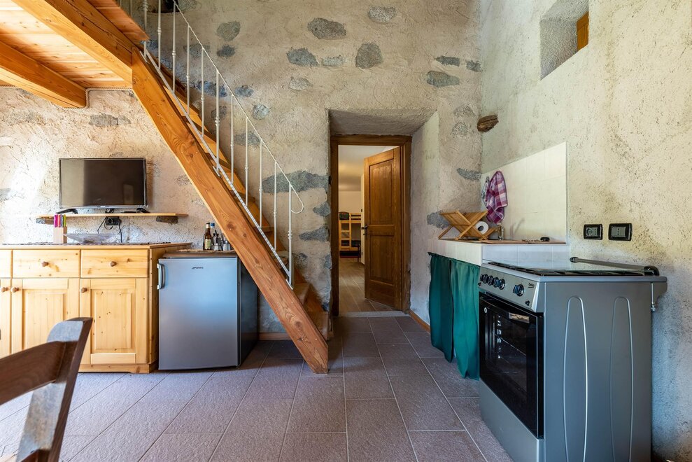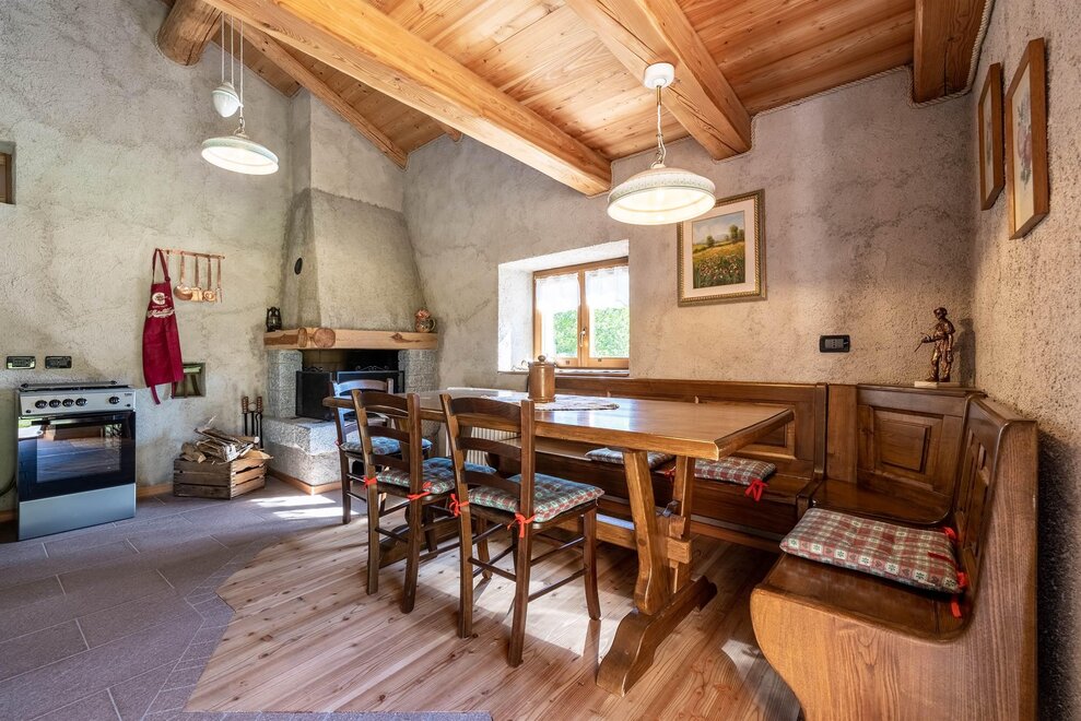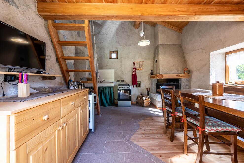 De chalet is gelegen op één niveau. De keuken, uitgerust met een koelkast met vriezer, gasfornuis en open haard, bevat de eettafel, waar je kunt genieten van maaltijden in het gezelschap van het knisperen van het vuur.
