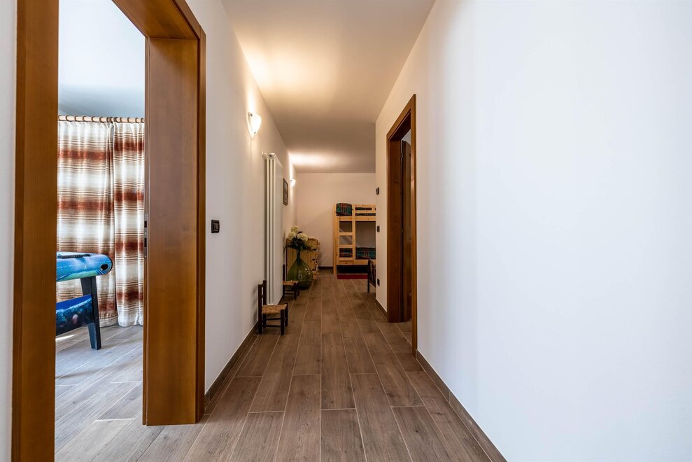 Verderop in de gang vind je aan de rechterkant een ruime badkamer (uitgerust met douche, bidet, toilet en wastafel) en een tweepersoons slaapkamer. Aan de linkerkant bevindt zich een ontspannings-/relaxruimte. Verderop is er een open ruimte (niet afgesloten met een deur), met 4 slaapplaatsen in twee stapelbedden.