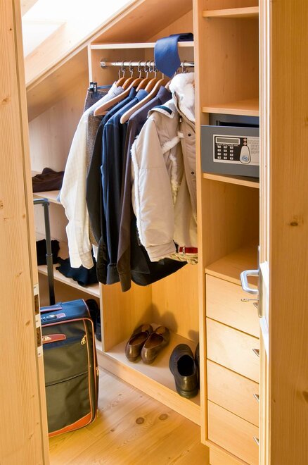 Superieure Mansarda Familiareda voor 2 tot 3 personen, ca. 23 m² gelegen op het noordoosten met balkon, een tweepersoonsbed/tweelingbedden en een eenpersoonsbed, op maat gemaakte inrichting in licht hout, Sky TV, badkamer met schuifdeur.