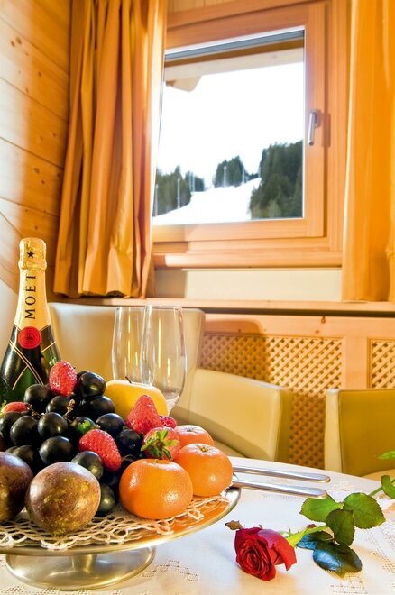 Junior Suite Boogvensters2 volwassenen + 1 kind, ca.29 m² gelegen aan de zuidwestkant, unieke ruimte met een tweepersoonsbed/twee eenpersoonsbedden en een slaapbank, maatwerkmeubilair in larikshout, balkon en Boogvensters met uitzicht op Campiglio en piste 3/Tre, Sky TV.