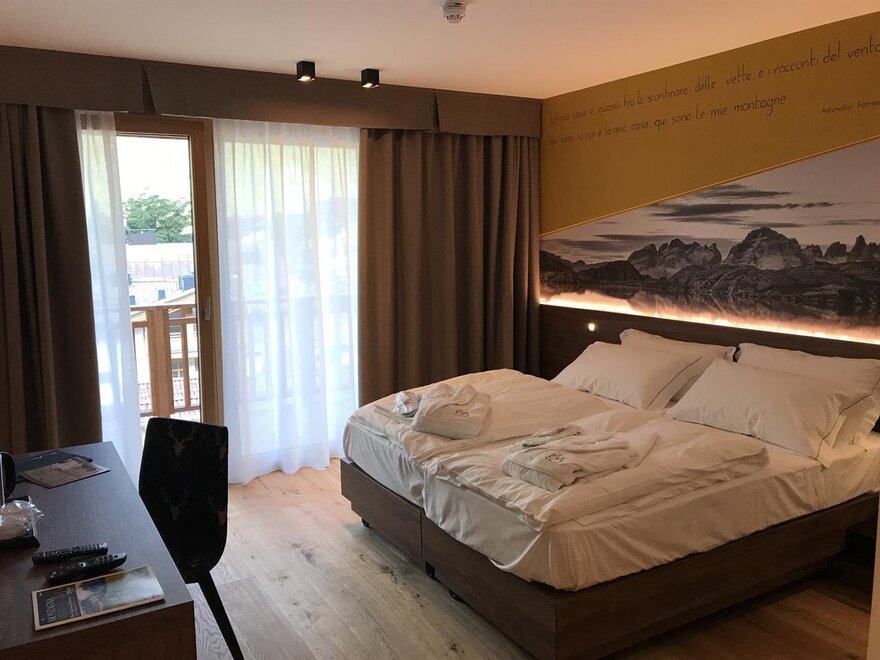 Moderne en verfijnde gezellige sfeer. De warme kleur van de stoffen van de DOLOMEET JUNIOR SUITE staat in contrast met de eenvoud van het gebrande staal, terwijl het glazen balkon uitnodigt om de omliggende natuur te contempleren en het blik te verleggen. De kamer beschikt over een kleedkamer, een slaapbank, een badkamer met aparte wc en bidet, en een ruime douche met ledverlichting. De interne indeling van deze kamer maakt het bijzonder comfortabel en geschikt voor gezinnen.
