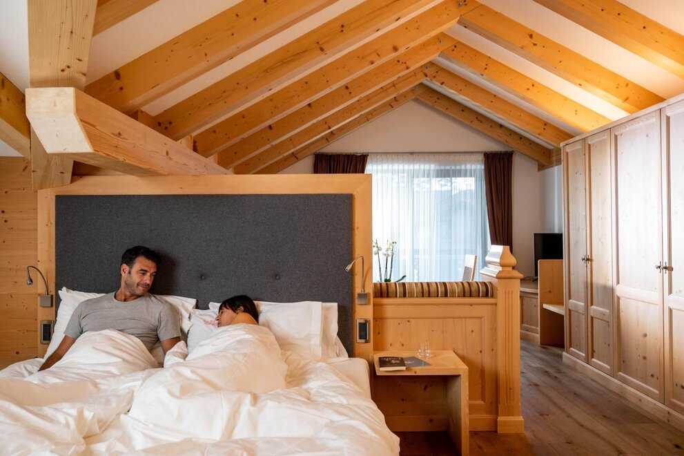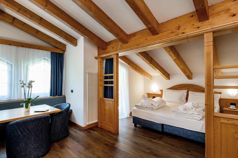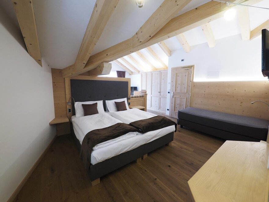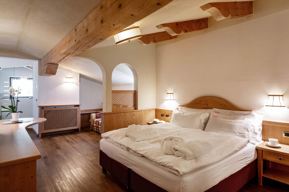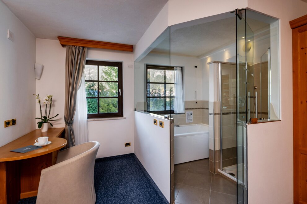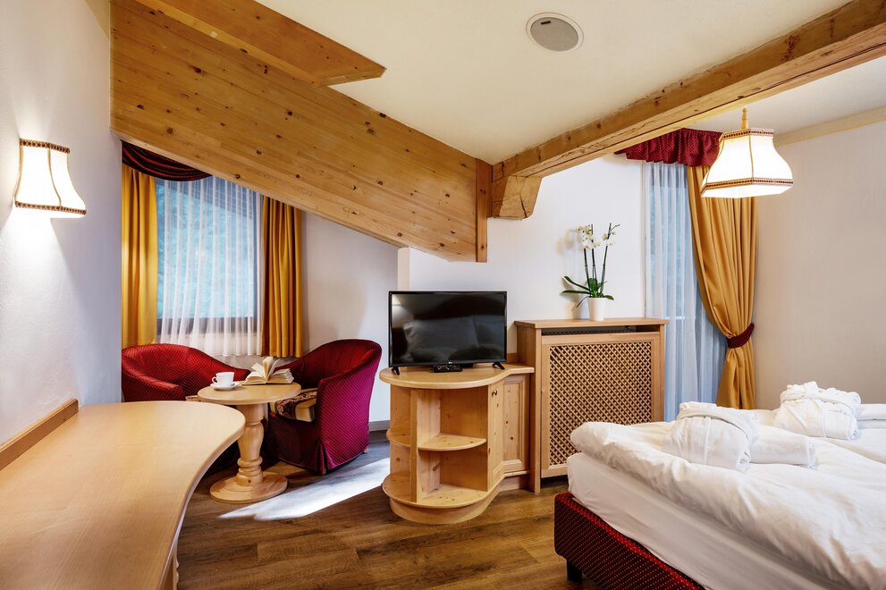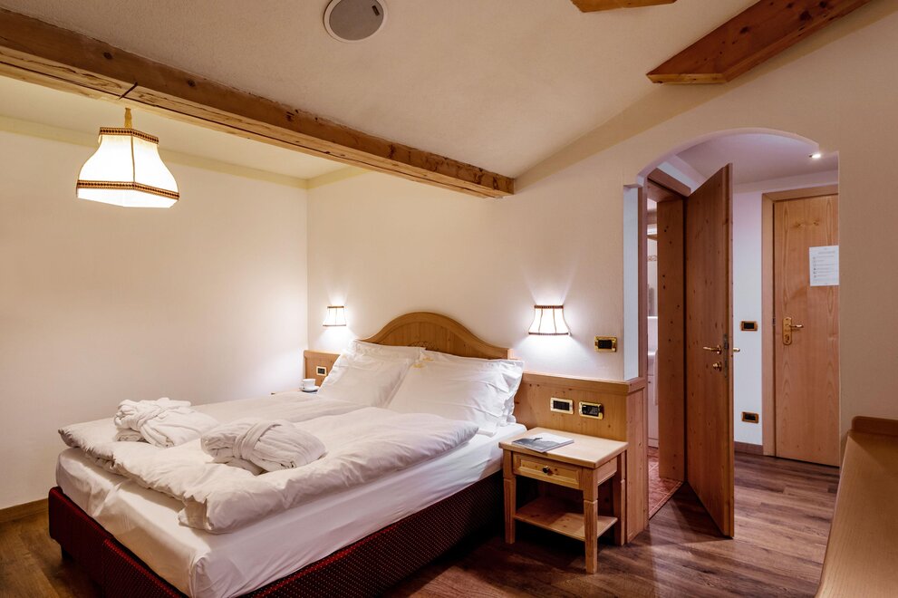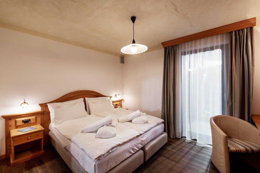 Onze Comfort Room is ingericht in de typische Ladinische stijl, voorzien van privéfaciliteiten, haardroger, telefoon, tv, een balkon met uitzicht op het bos, kluis, muziekdiffusiesysteem en winterverwarming met in de kamer instelbare temperatuur.