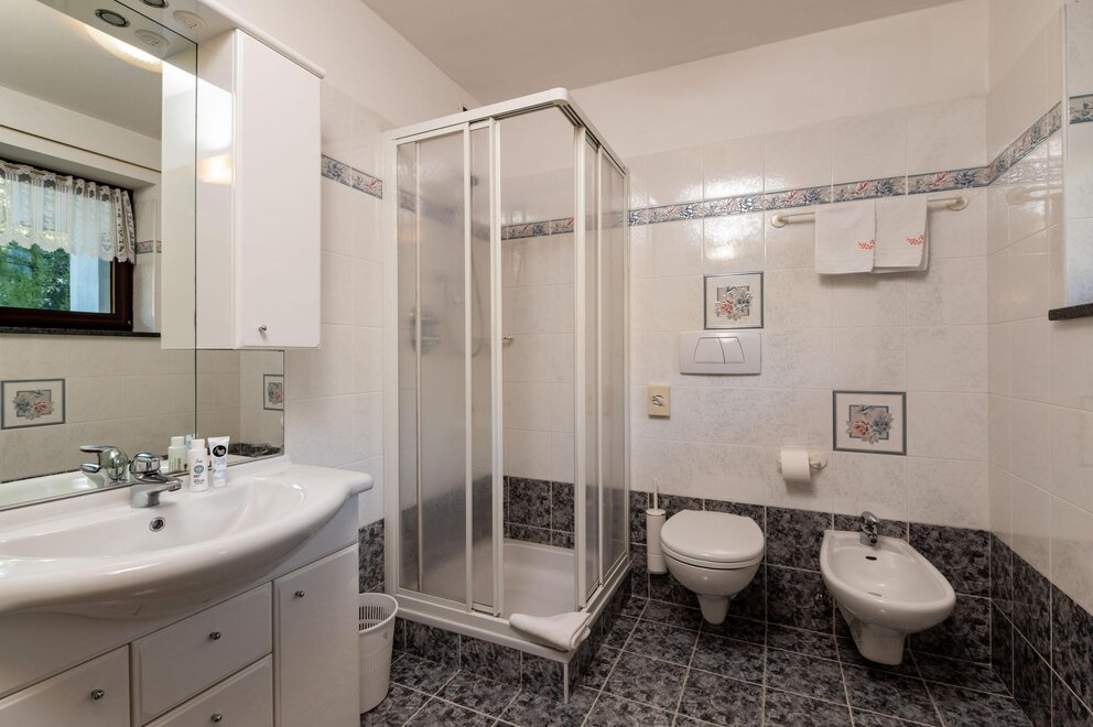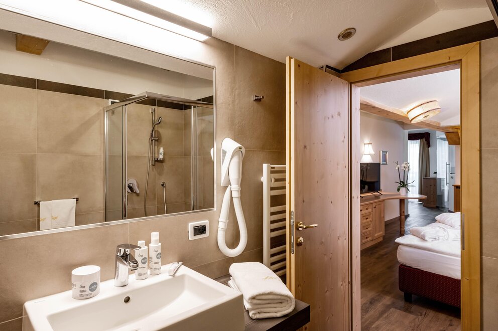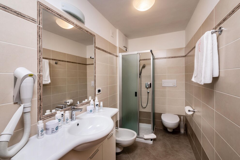 Een klein geschenk met cosmetica van de lijn Terme Dolomia, een zachte badjas en, op verzoek, slippers voor het gebruik van het kuuroord "Terme Dolomia", gemakkelijk te bereiken met de lift vanuit de kamer.Inrichting badkamer