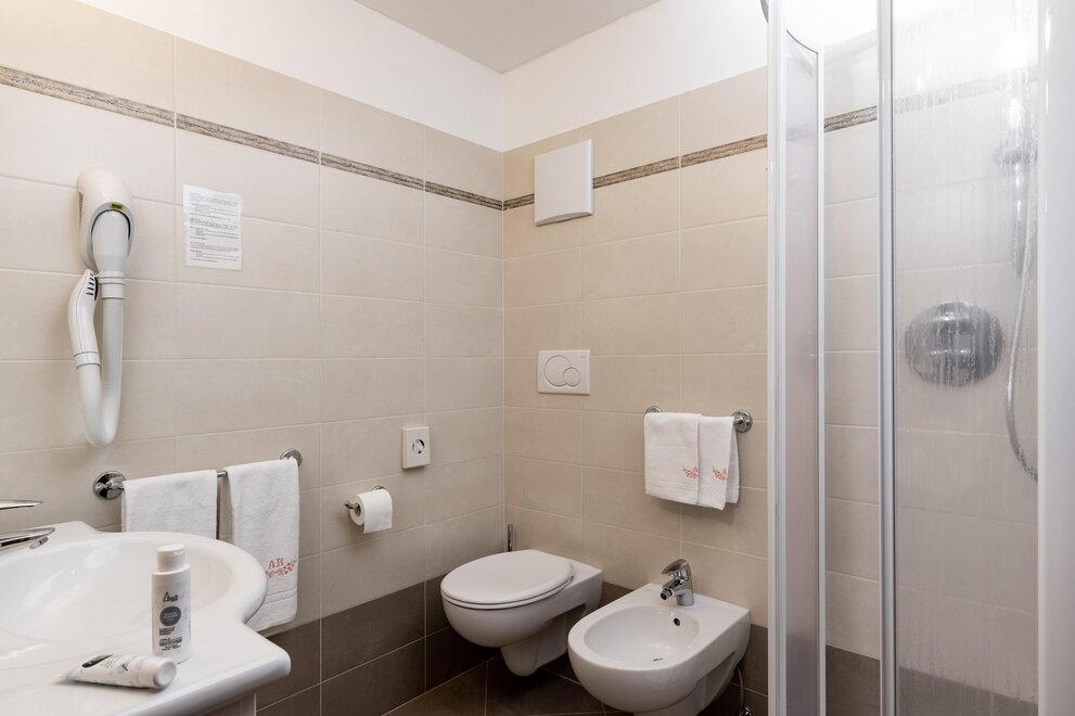 Een klein geschenk van cosmetische producten van de Terme Dolomia-lijn, een zacht badjas en, op verzoek, slippers om te gebruiken in het Wellnesscentrum "Terme Dolomia", dat gemakkelijk met de lift vanuit uw kamer te bereiken is.Inrichting badkamer