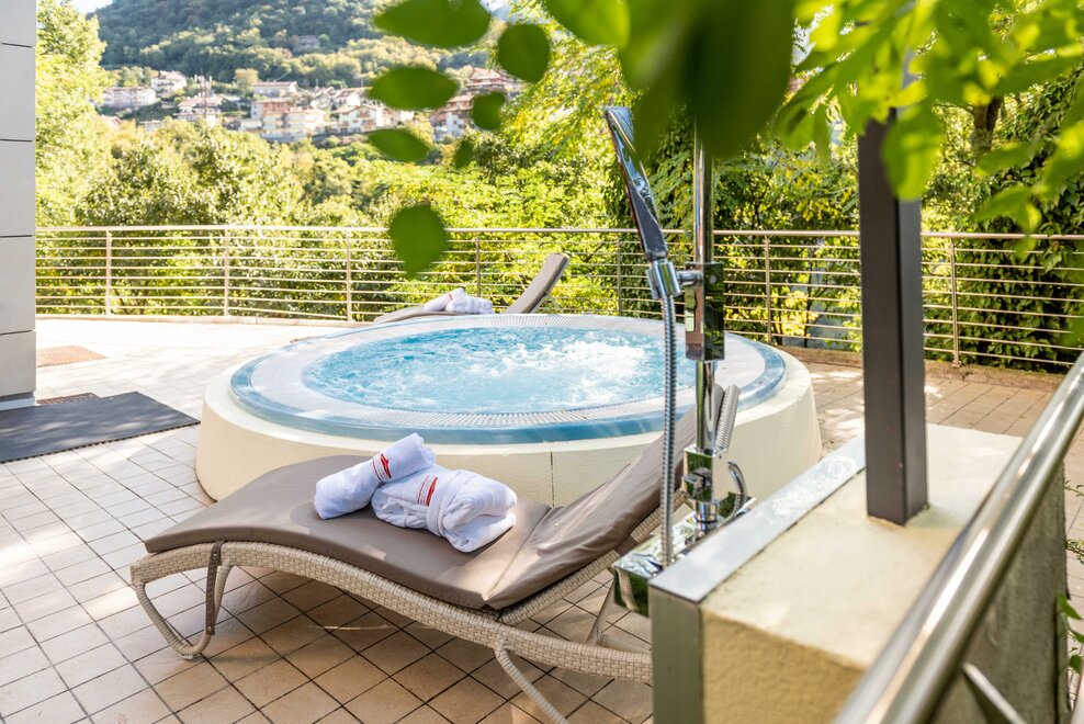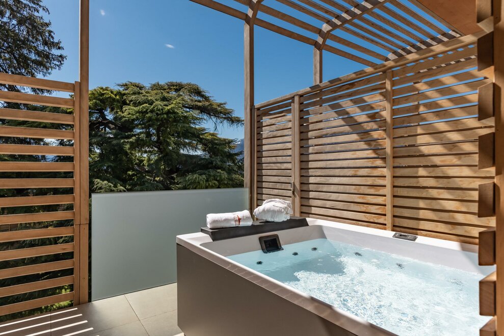 Dit specifieke type Belvedere-kamer heeft grote en lichte ramen, waardoor je toegang hebt tot een balkonnetje, uitzicht op de tuin of het heuvelachtige landschap, voorzien van een privé buitenspa.