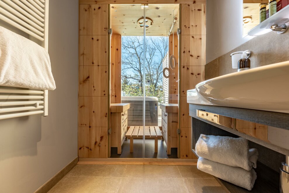 De hoofd badkamer is de echte verrassing van deze kamer: tegenover de douche heet de panoramasauna voor twee personen met uitzicht op het grote terras met een privé Jacuzzi. Hier, of liggend op de ligstoelen, kunt u uw laten omarmen door het spectaculaire panorama van de vallei en zijn wijnvelden.