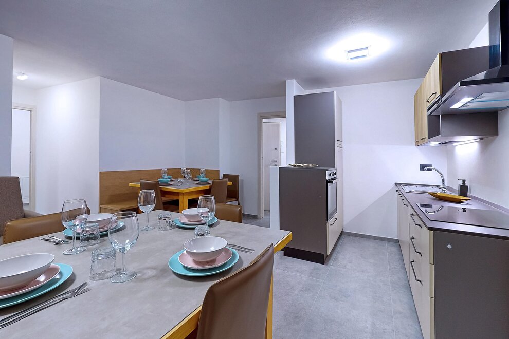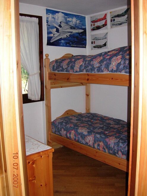 Apartement met een slaapkamer met tweepersoonsbed en twee slaapkamers met stapelbedden, slaapbank voor twee personen, goed uitgeruste en ruime keuken.