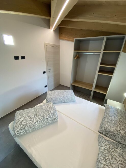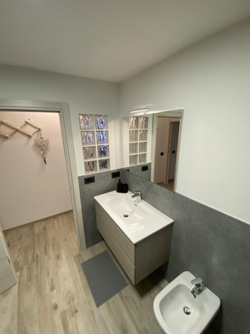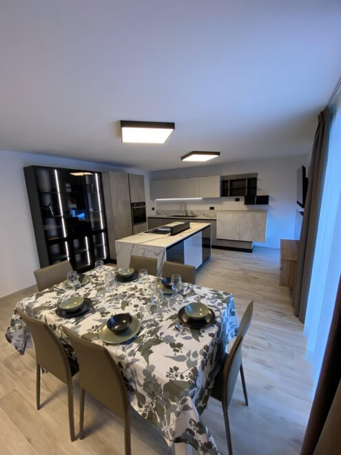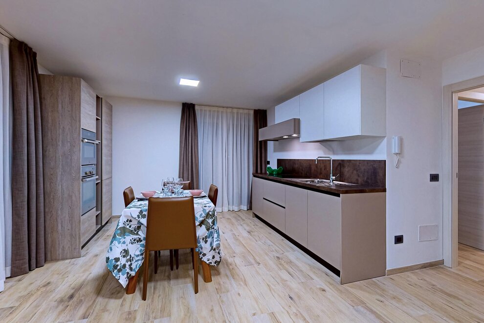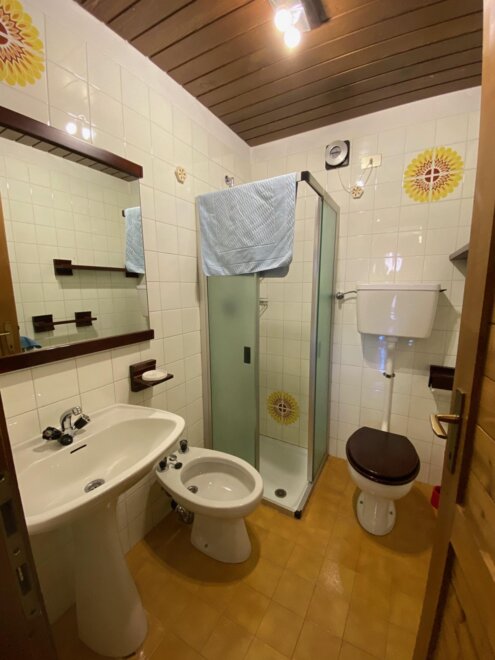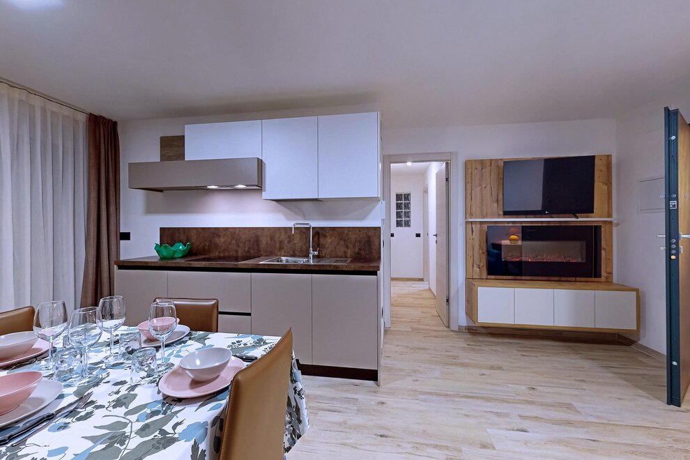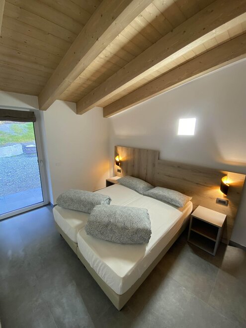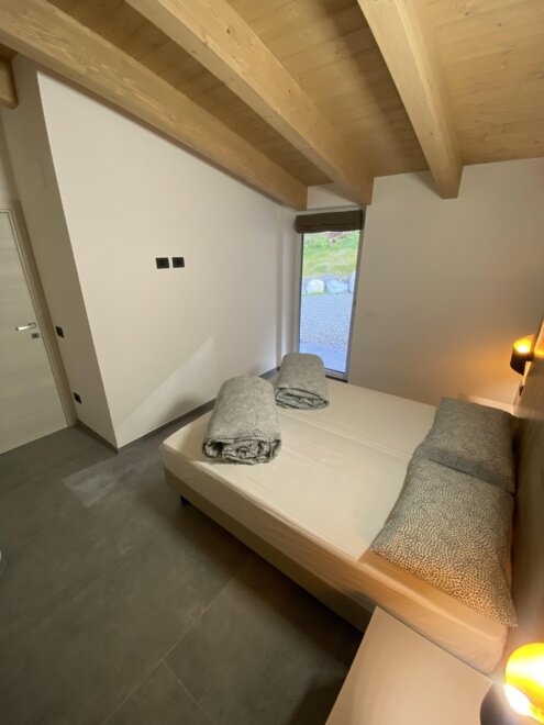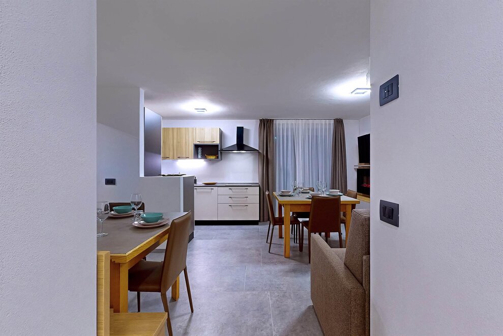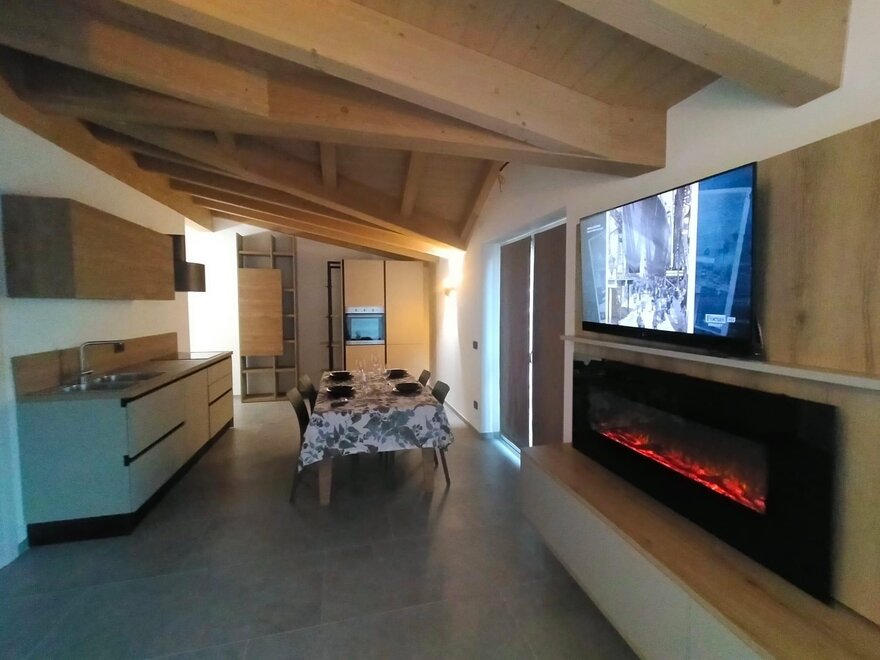 Onafhankelijke ingang op de begane grond. De keuken is ruim en licht, met directe toegang tot het terras. Deze is uitgerust met inductiekookplaten, een grote koelkast met ladevriesvak, oven en vaatwasser. De woonkamer, gezellig en voorzien van een comfortabele tweepersoons slaapbank, is verrijkt met een Smart TV en een elektrische haard. Drie tweepersoon slaapkamers, waarvan er twee in aparte eenpersoonsbedden kunnen worden gescheiden, allemaal met een kast. De twee badkamers, ruim en functioneel, zijn uitgerust met een wastafel, bidet, wc en ruime douches. Daarnaast is er een berging voor ski's met een skischoenverwarming.
