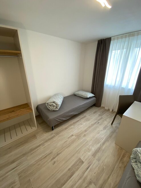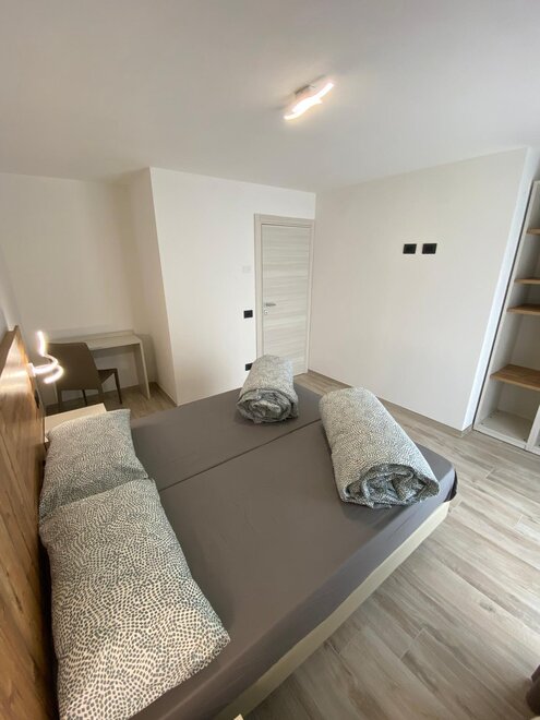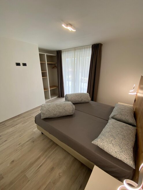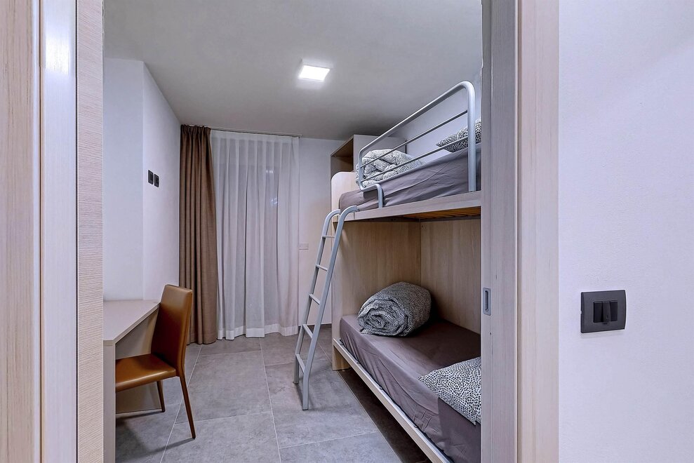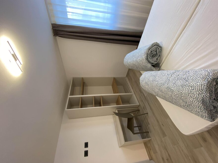 Appartement met gemakkelijke toegang zonder trappen, uitgang naar de gemeenschappelijke groene buitenruimte. Bestaat uit een slaapkamer, een kamer met twee stapelbedden en een tweepersoons slaapbank.