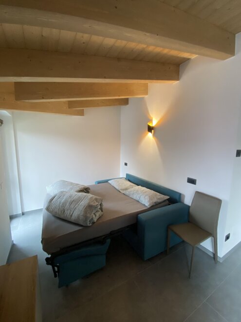 Slaapkamer met tweepersoonsbed en woonkamer met slaapbank