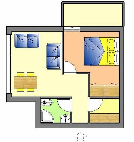 Appartement direct aan de pistes, woonkamer met ruim balkon, slaapkamer met een tweepersoonsbed, kamer met stapelbed en extra bed, slaapbank. Douche badkamer. Garage met skischoenverwarming