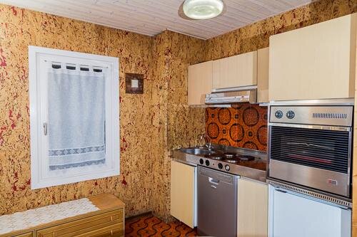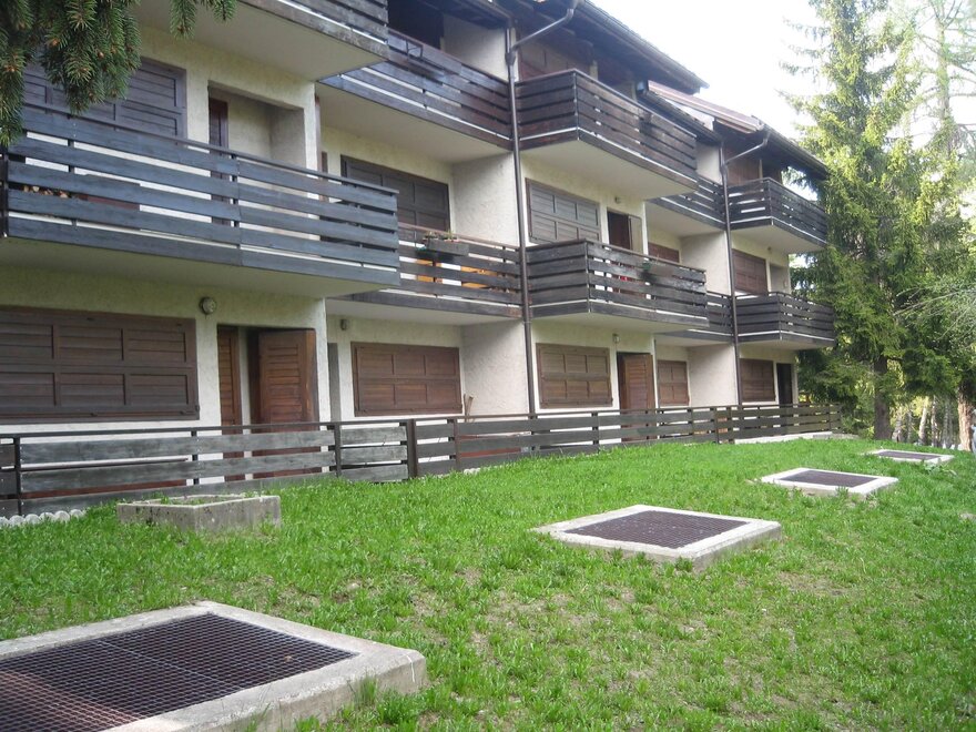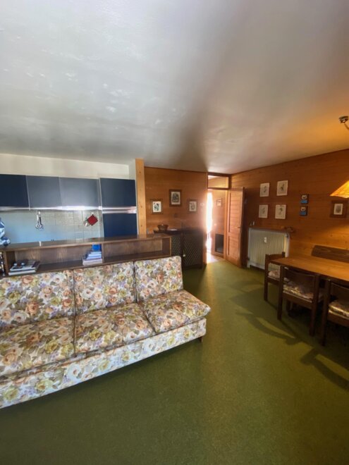 DRIEKAMERAPPARTEMENT met een kamer met twee eenpersoonsbedden, een kamer met stapelbedden, een woonkamer met een slaapbank, een kitchenette en een douchebadkamer. Twee ruime balkons op de begane grond, toegang tot het gemeenschappelijk groen. Een ruime, goed uitgeruste keuken met een grote koelkast en open haard. Heel dicht bij de blauwe piste. Parkeerplaats beschikbaar in de garage.