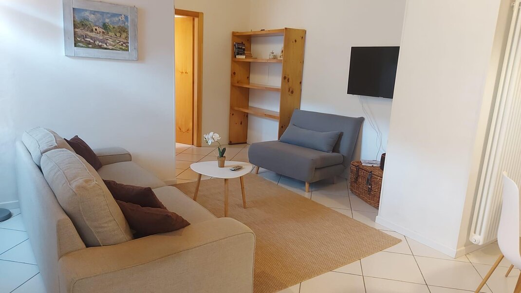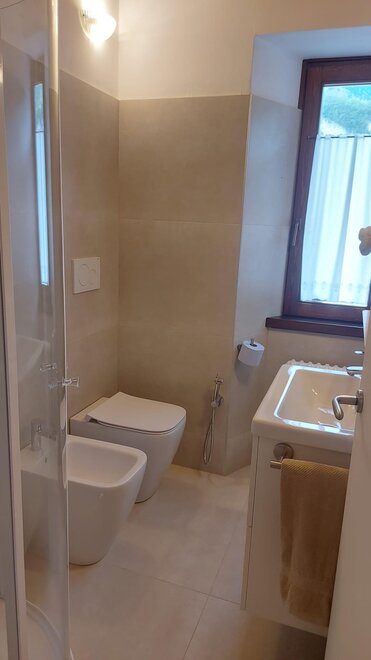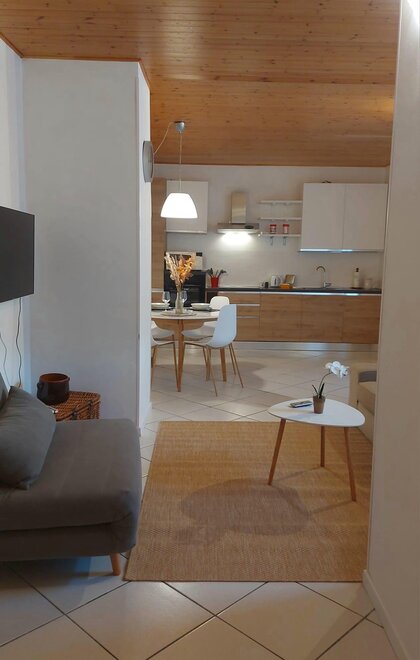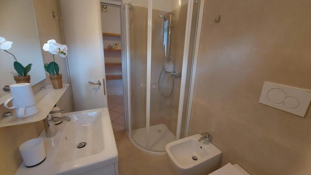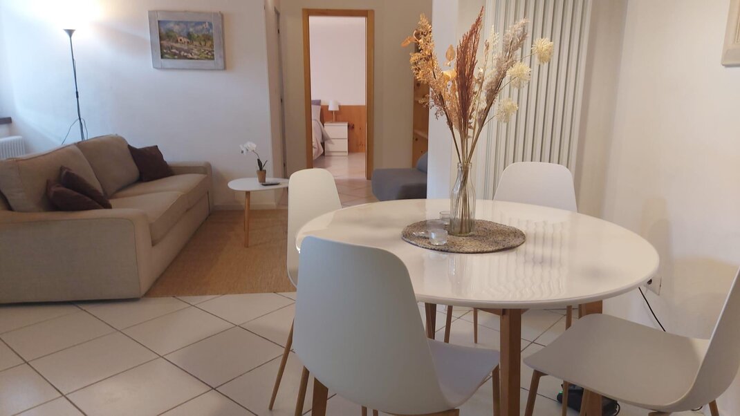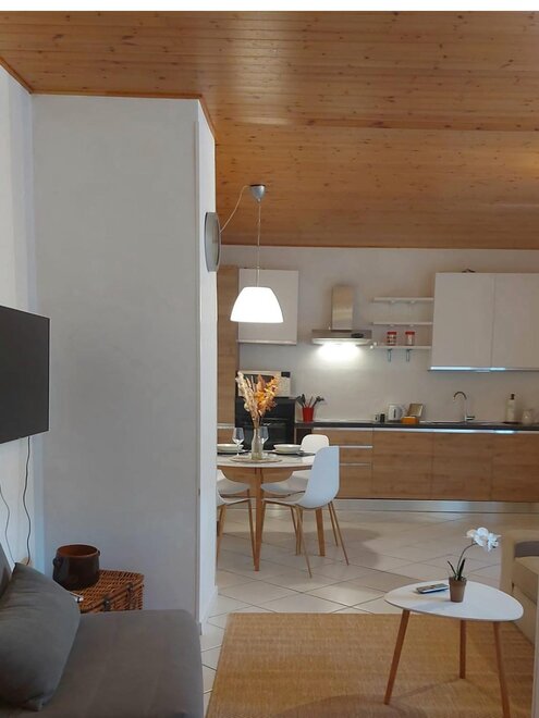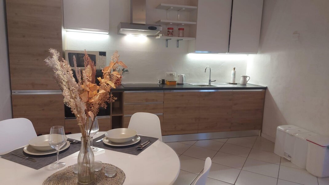 Het bestaat uit een woonkamer en keuken met pannen, serviesgoed, vaatwasser, koelkast, inductiekookplaat met 4 pitten, oven, magnetron, waterkoker, Italiaanse moka voor koffie. Badkamer met douche. Slaapkamer met tweepersoonsbed. Bedlinnen en handdoeken altijd bij de prijs inbegrepen. Specifieke containers voor afvalscheiding zijn aanwezig.