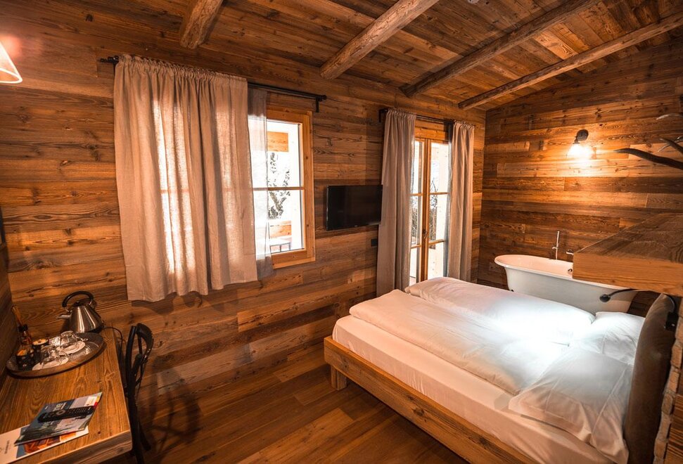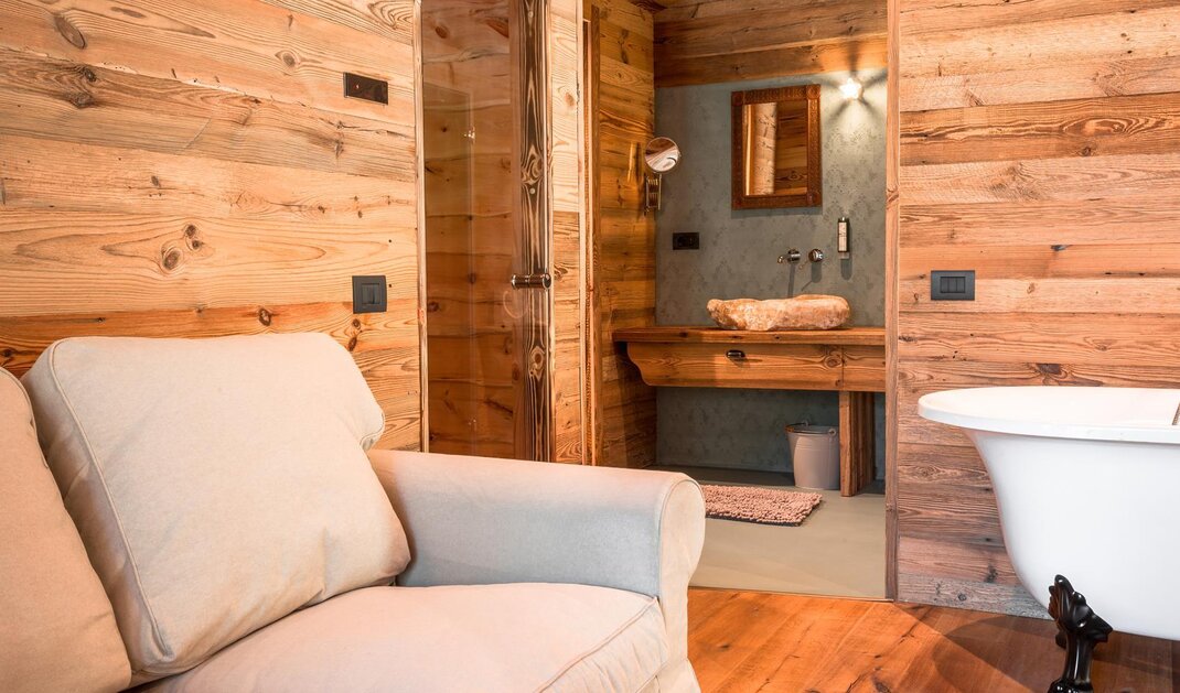 Deze ruime kamer in alpine stijl is verrijkt met een freestanding bad en garandeert dus een verblijf van absolute ontspanning. De ideale keuze voor wie zoekt naar een extraatje van comfort.