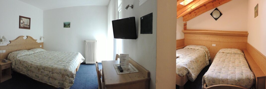 Gezellige driepersoonskamer met privéfaciliteiten, ingericht in houten bergstijl met een vloer van tapijt of parket. Beschikbaar zijn een LCD-tv, telefoon en kluis. De meeste van onze kamers hebben een balkon met uitzicht op de bergen. Toegang tot internet WI-FI beschikbaar.