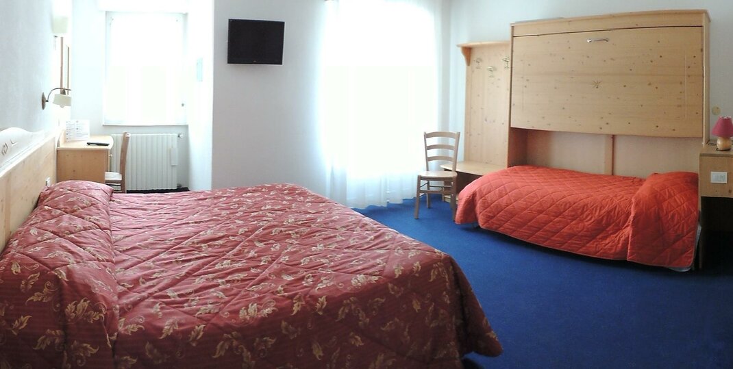 Gezellige kamer met drie bedden en eigen voorzieningen, ingericht in bergstijl met houten meubels en een vloer van tapijt of parket. Beschikbaar: LCD-tv, telefoon en kluis. De meeste van onze kamers zijn voorzien van een balkon met uitzicht op de bergen. Toegang tot WI-FI-internet beschikbaar