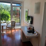 Comfortabele en lichte suite van 38 vierkante meter, afgewerkt met houten vloeren, bestaande uit een slaapkamer met balkon en een grote inloopkast, woonkamer met een comfortabele slaapbank voor twee personen en een ruime bewoonbare terras met uitzicht op de tuin.